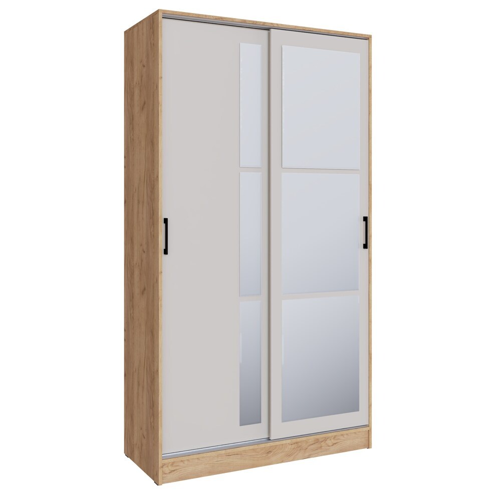 Удобные раздвижные двери предоставляют доступ к вместительной платяной секции с металлической штангой для вешалок с одеждой и боковой пенальной секции с пятью полками, расположенными одна над другой.