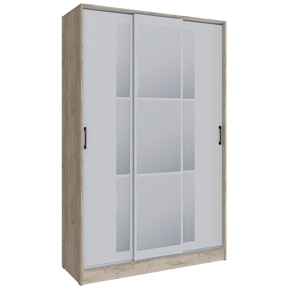 Удобные раздвижные двери предоставляют доступ к вместительной платяной секции с металлической штангой для вешалок с одеждой и боковой пенальной секции с пятью полками, расположенными одна над другой.