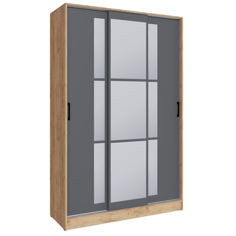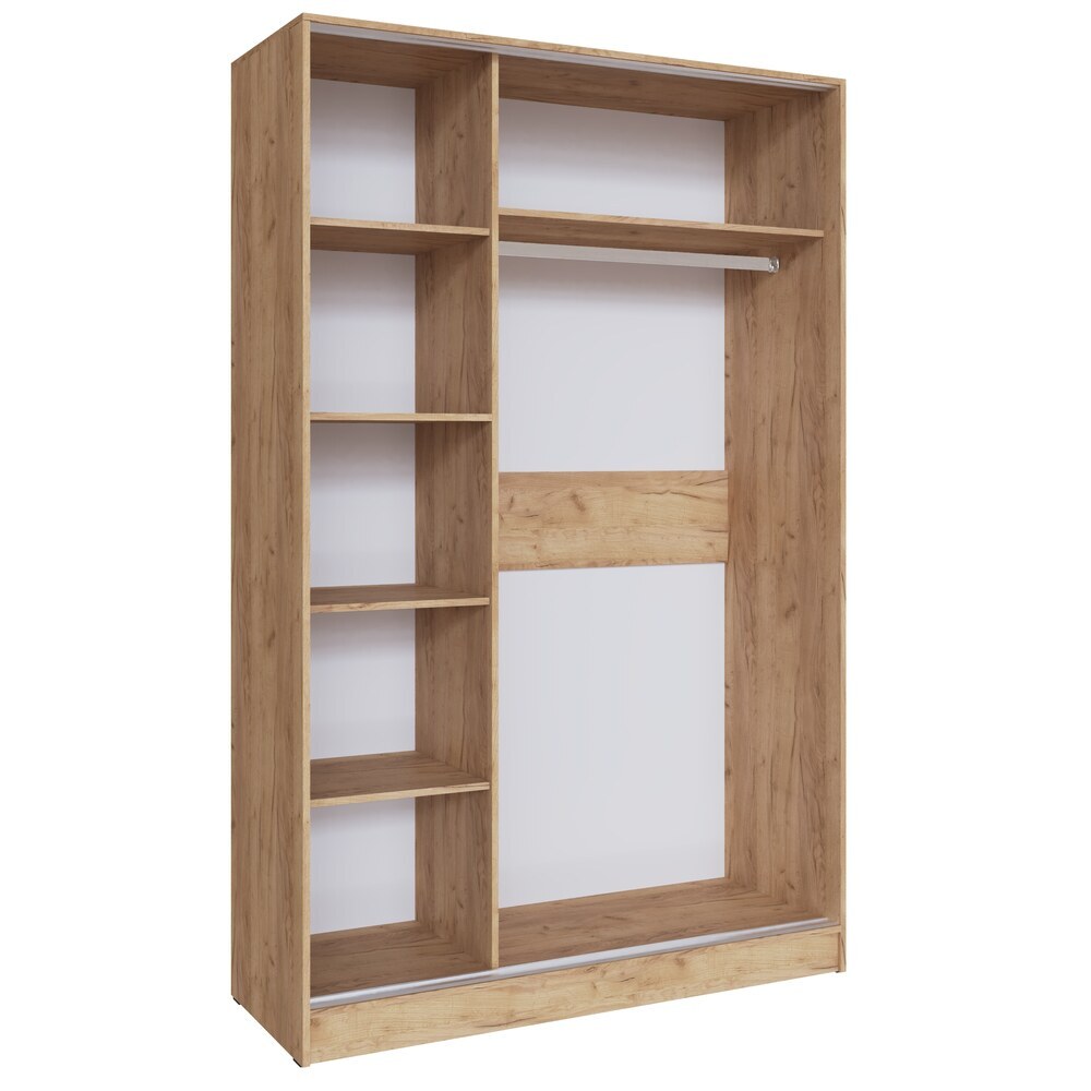 Удобные раздвижные двери предоставляют доступ к вместительной платяной секции с металлической штангой для вешалок с одеждой и боковой пенальной секции с пятью полками, расположенными одна над другой.