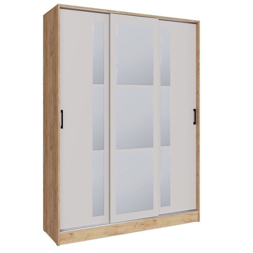 Удобные раздвижные двери предоставляют доступ к вместительной платяной секции с металлической штангой для вешалок с одеждой и боковой пенальной секции с пятью полками, расположенными одна над другой.