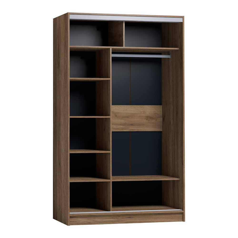 Продуманное внутреннее наполнение шкафа состоит из стеллажа для белья и стационарной штанги длиной 725 мм. На ней поместится как минимум 10 плечиков с верхней одеждой. В изготовлении шкафов-купе STRIKE использована прочная стальная система треков «Найди» цвета Металлик. Двери шкафов дополнены ручками из массива и шлегелем, который смягчает удары дверей при закрывании, а также защищают вещи от попадания пыли. Благодаря скрытым полкодержателям полки жестко крепятся на необходимой высоте.