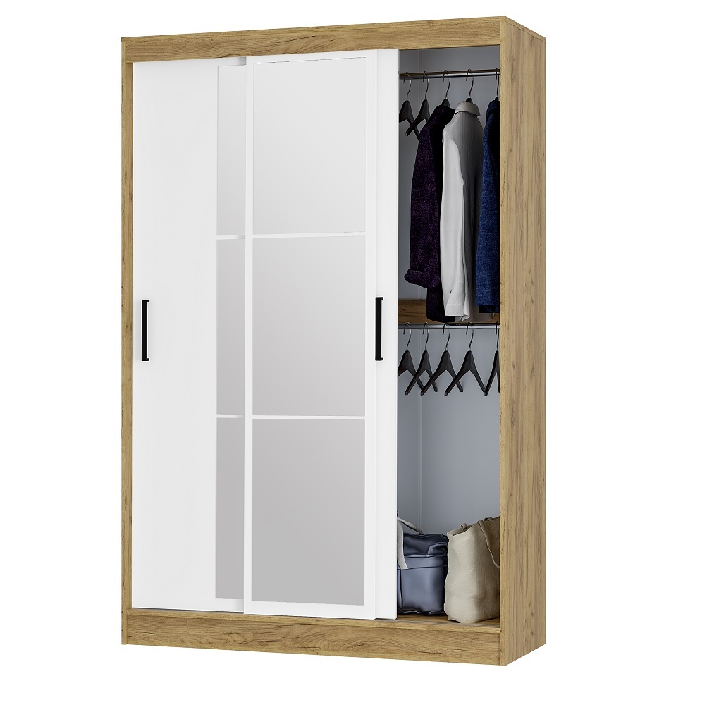 Раздвижные створки снабжены удобными ручками, центральная створка полностью декорирована зеркалом с еврокромкой, которое создаёт иллюзию расширенного пространства.