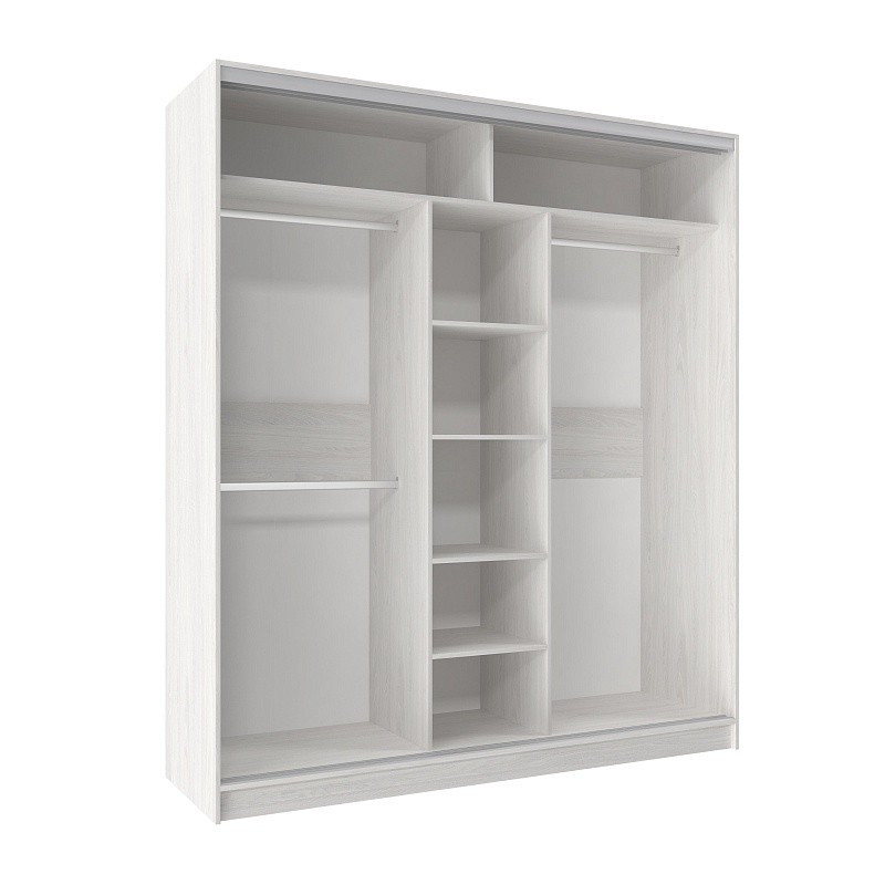 В шкафу-купе шириной 2 м найдется место для гардероба всей семьи. Разместите в нем бельё, верхнюю одежду, головные уборы и саквояж. Продуманное внутреннее наполнение, состоящее из трёх стационарных штанг и полок для белья, позволяет зонировать хранение одежды каждого члена семьи. Благодаря разделению фасада на три двери, доставать вещи очень легко. Зеркало центральной двери с обратной стороны проклеено специальной защитной пленкой, которая предотвратит от падения осколков, если оно разобьется. Если нужно взять вещи из шкафа в темное время суток и при этом не разбудить супруга,установитеКарниз 101 Домашнийс подсветкой.