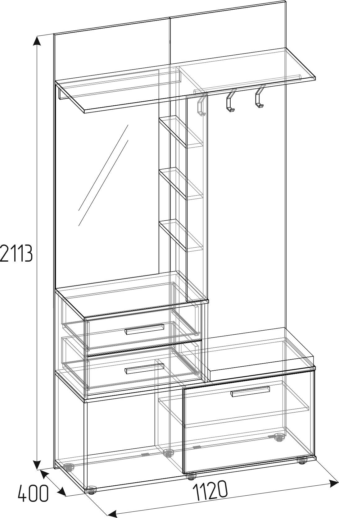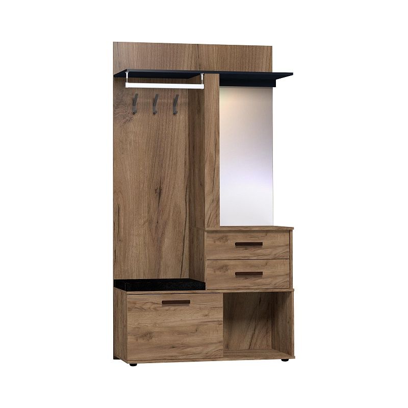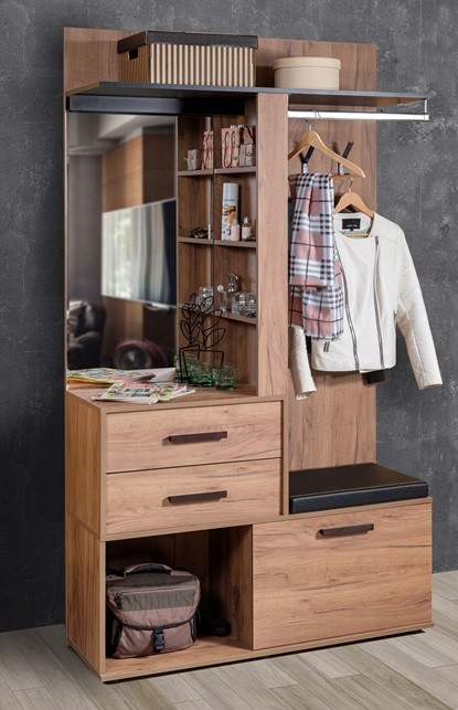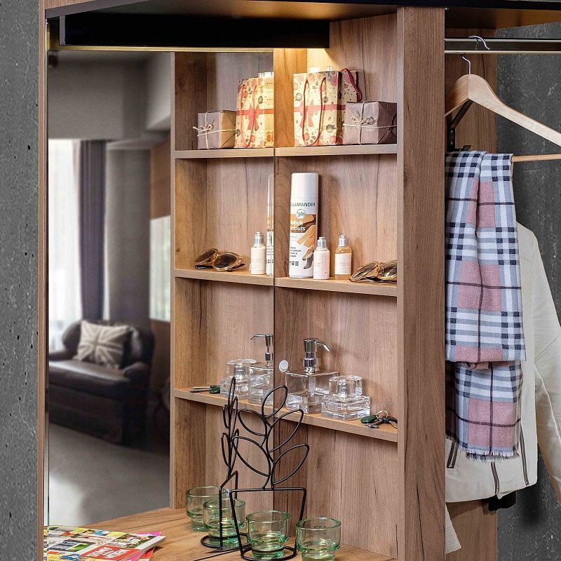 Комбинированный модуль Nature 70 Шкаф МЦН можно расположить в прихожей в составе шкафной группы или автономно. В небольшом по габаритам модуле сочетается всё необходимое: открытая вешалка, тумба для обуви, полка для головных уборов, выдвижные ящики, зеркало с подсветкой. Встроенная светодиодная подсветка включается при помощи аккуратного кнопочного выключателя. Выдвижные ящики оснащены шариковыми направляющими. Откидной фасад обувной тумбы дополнительно фиксируется при закрывании магнитной защелкой. В комплектацию входит мягкая подушка из черной экокожи с золотой строчкой. Собрать шкаф МЦН можно как на правую, так и на левую сторону.