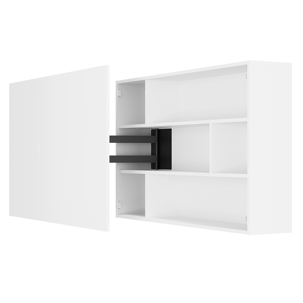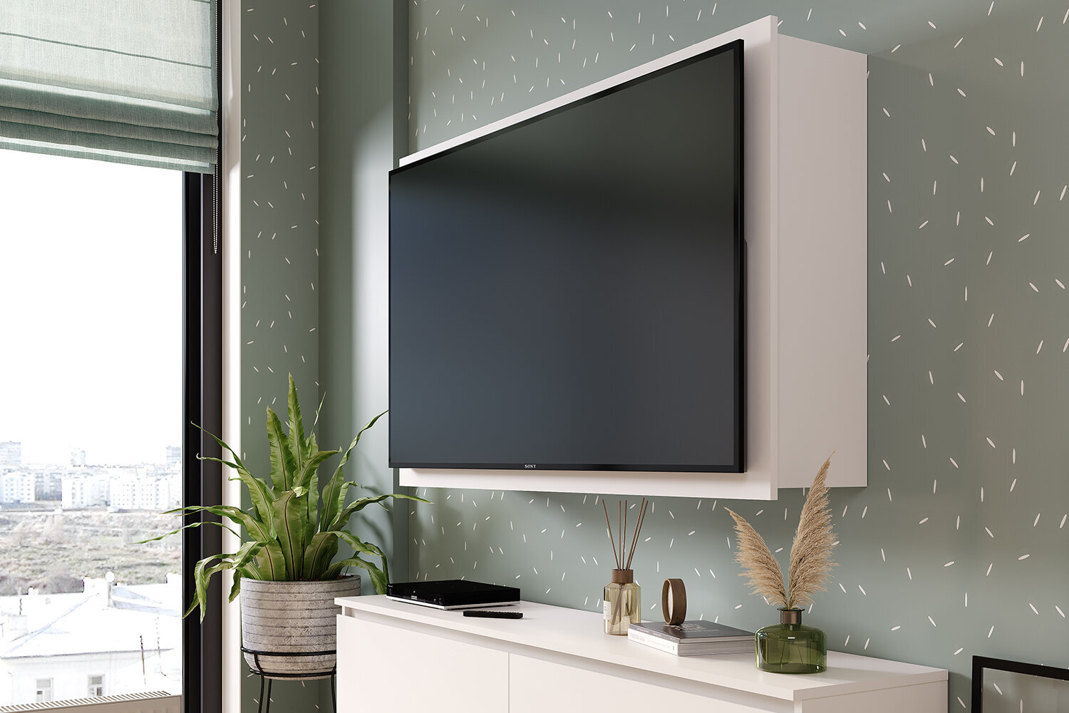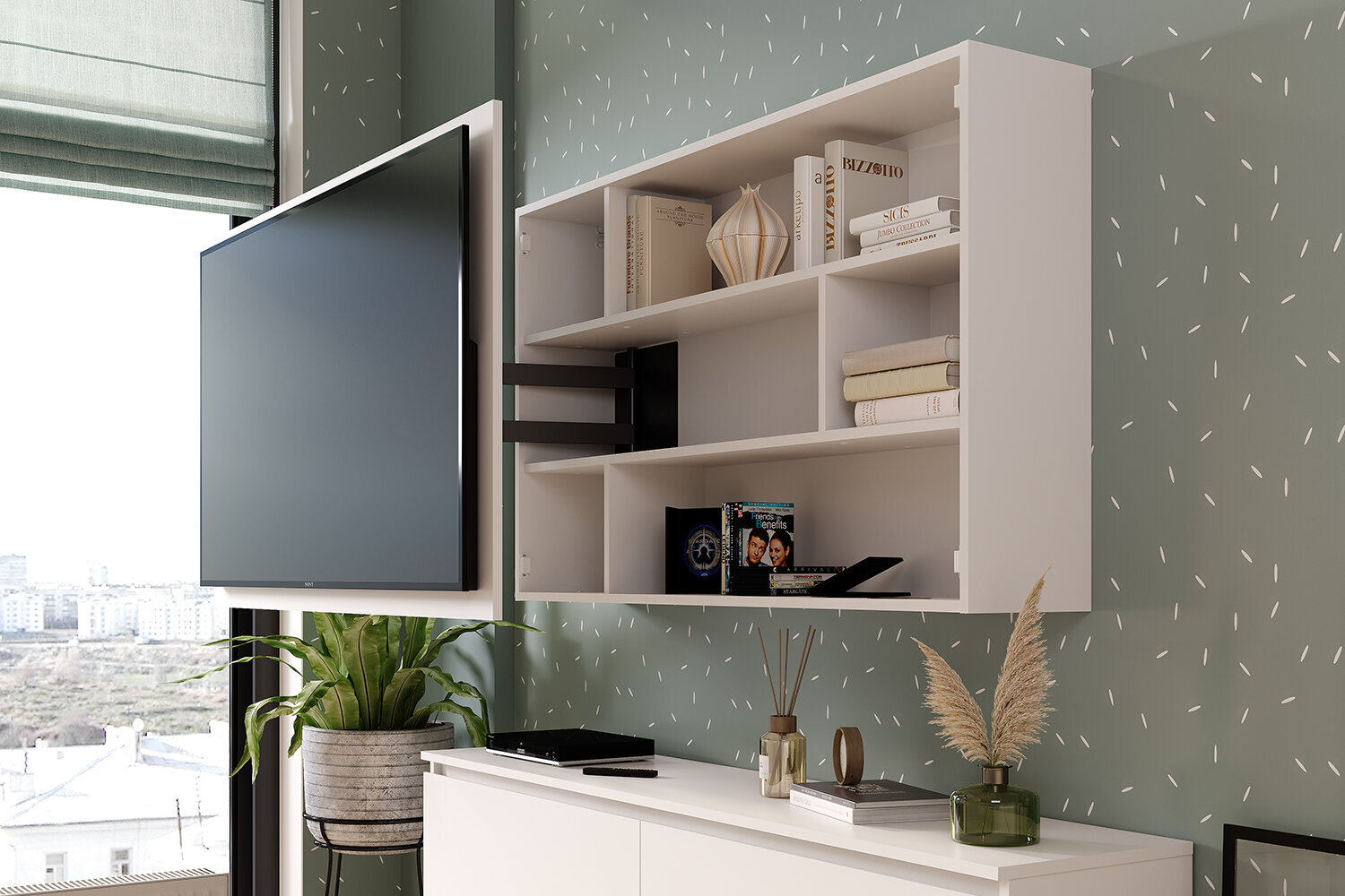 Навесной шкаф под ТВ Эко идеально подходит к телевизорам с большим плоским экраном. Внутри шкафа множество полок. Телевизор фиксируется на фасаде шкафа, который в свою очередь закрепляется на кронштейне. Шкаф выполнен в белом цвете с текстурой среза натурального дерева. Монтаж шкафа осуществляется на несущей стене. Место под ТВ 1150х720 мм (крепится к передней панели). Максимальная нагрузка на шкаф до 30 кг. Максимальная нагрузка на полку до 5 кг.