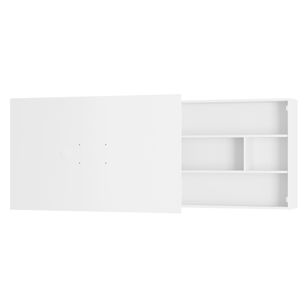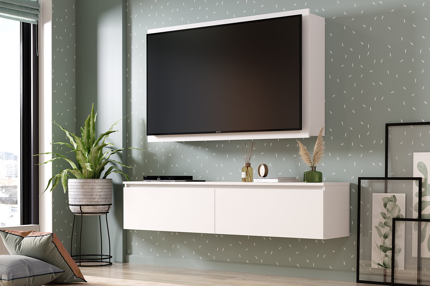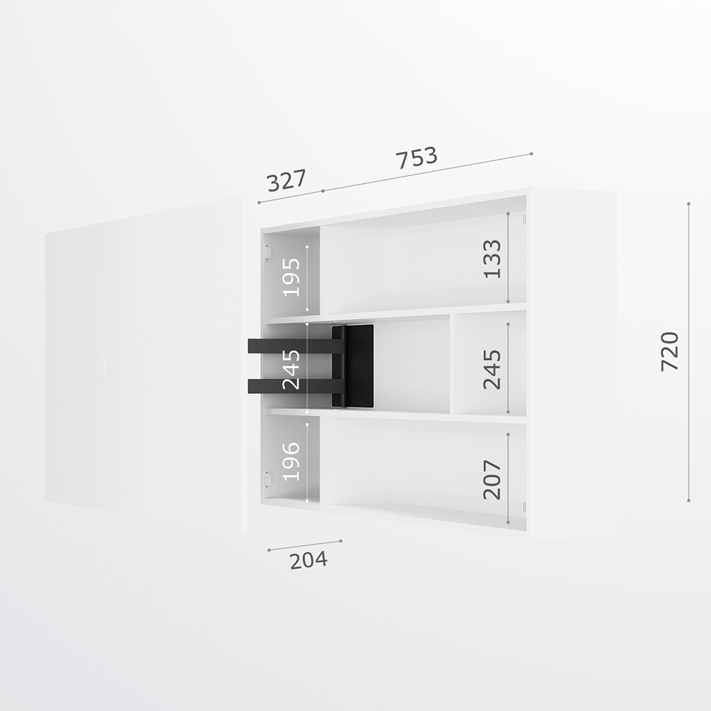 Навесной шкаф под ТВ Эко идеально подходит к телевизорам с большим плоским экраном. Внутри шкафа множество полок. Телевизор фиксируется на фасаде шкафа, который в свою очередь закрепляется на кронштейне. Шкаф выполнен в белом цвете с текстурой среза натурального дерева. Монтаж шкафа осуществляется на несущей стене. Место под ТВ 1150х720 мм (крепится к передней панели). Максимальная нагрузка на шкаф до 30 кг. Максимальная нагрузка на полку до 5 кг.