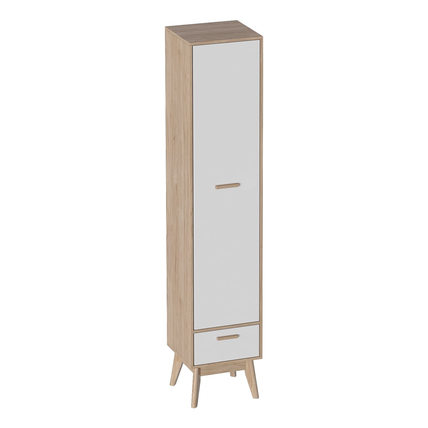 Шкаф с двумя отделениями. Верхнее отделение закрыто дверью, за которой расположены две стационарных и две съемных полки, в нижнем - размещен выдвижной ящик на шариковых направляющих.