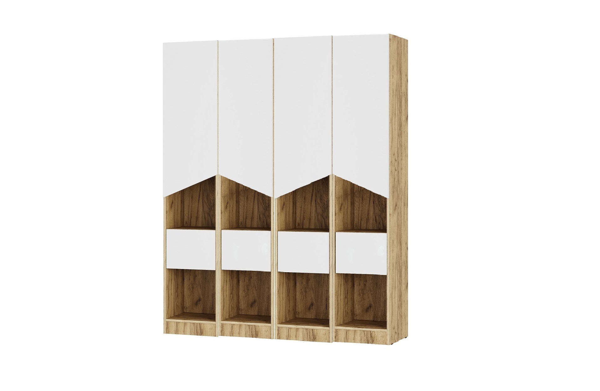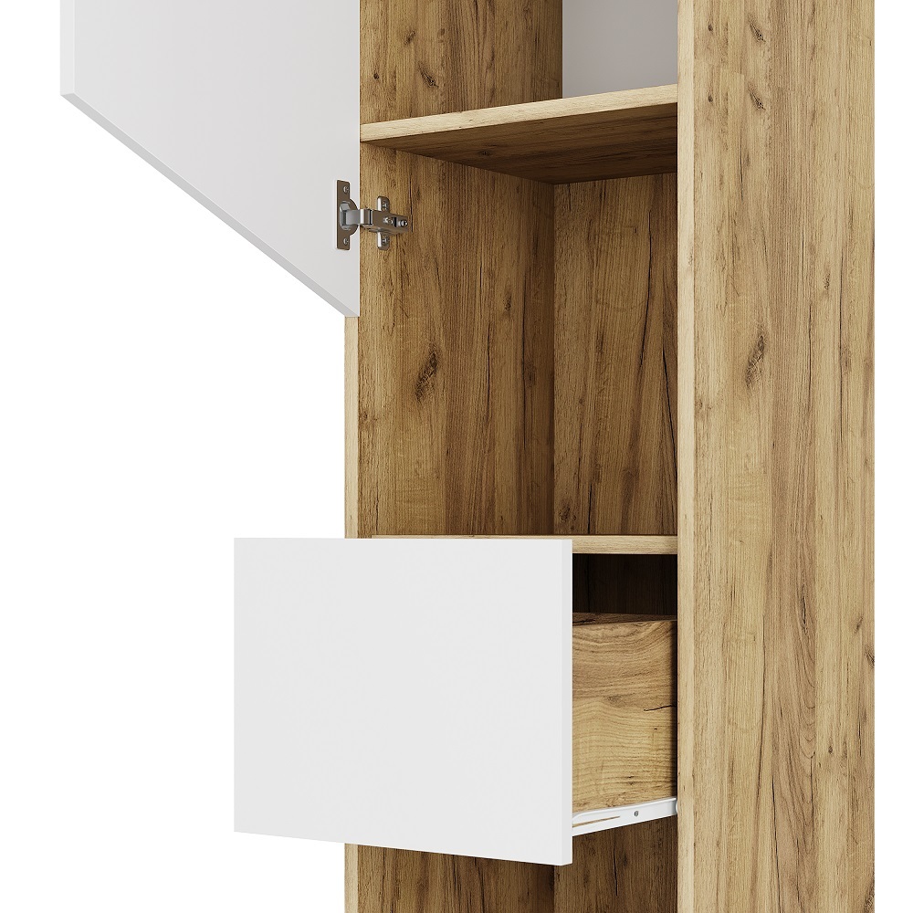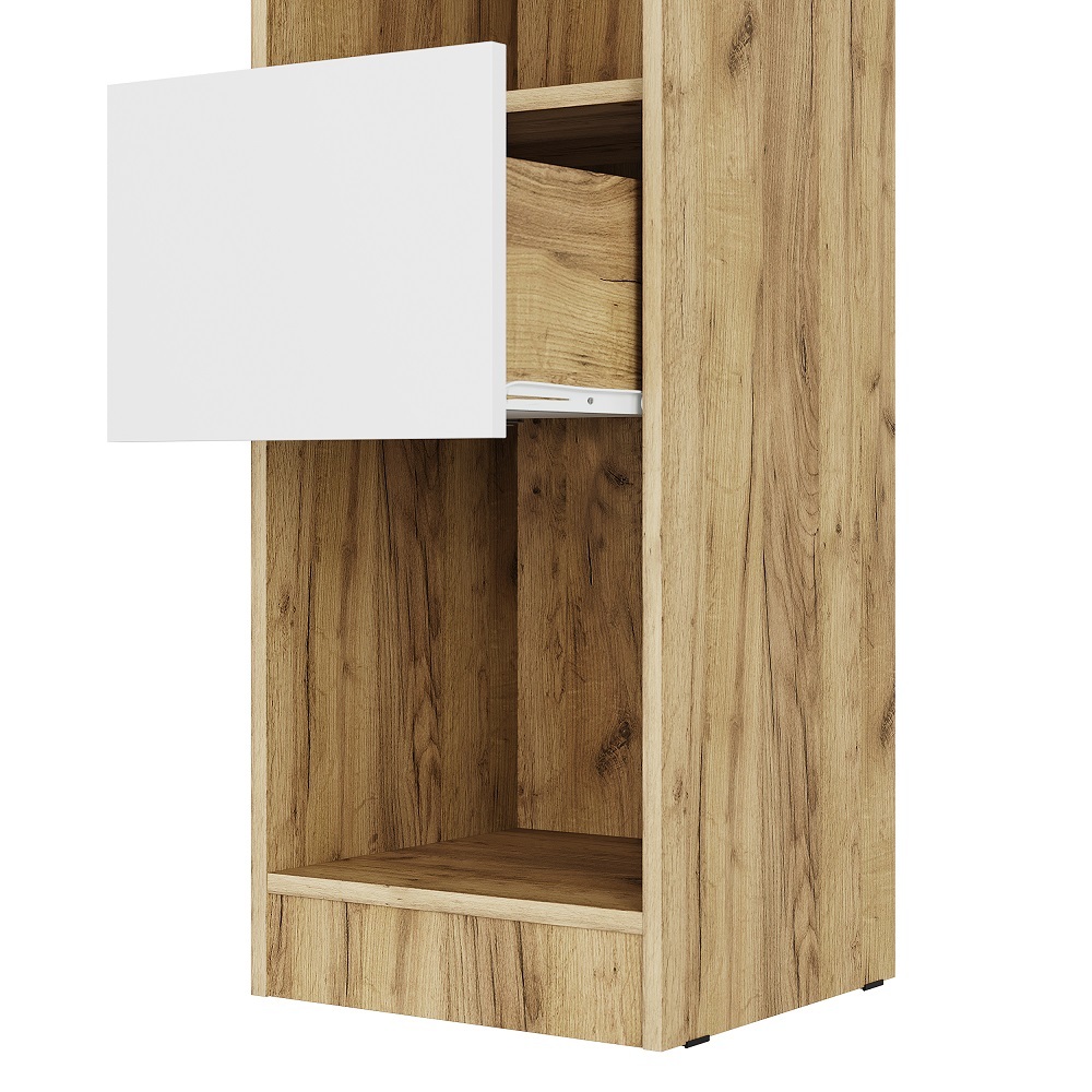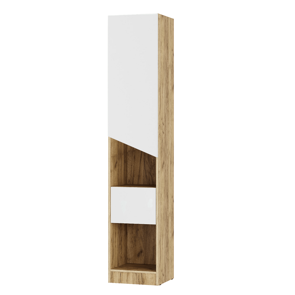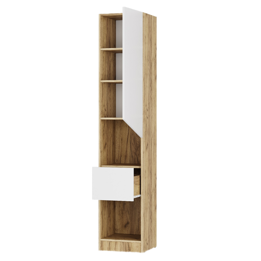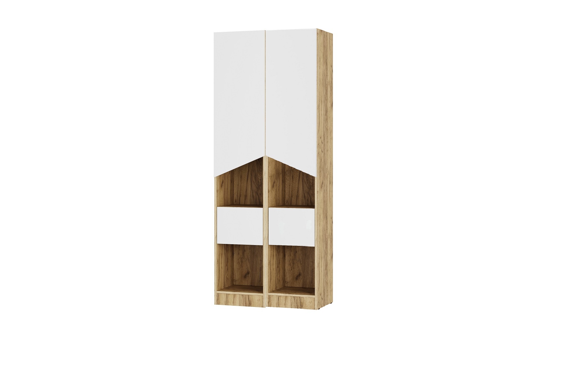 Шкаф-пенал для детской в сканди-стиле. Приятное сочетание цвета корпуса "дуб ирландский" и белых фасадов визуально облегчит и освежит интерьер комнаты. За распашным фасадом скрываются полки - 3 шт.