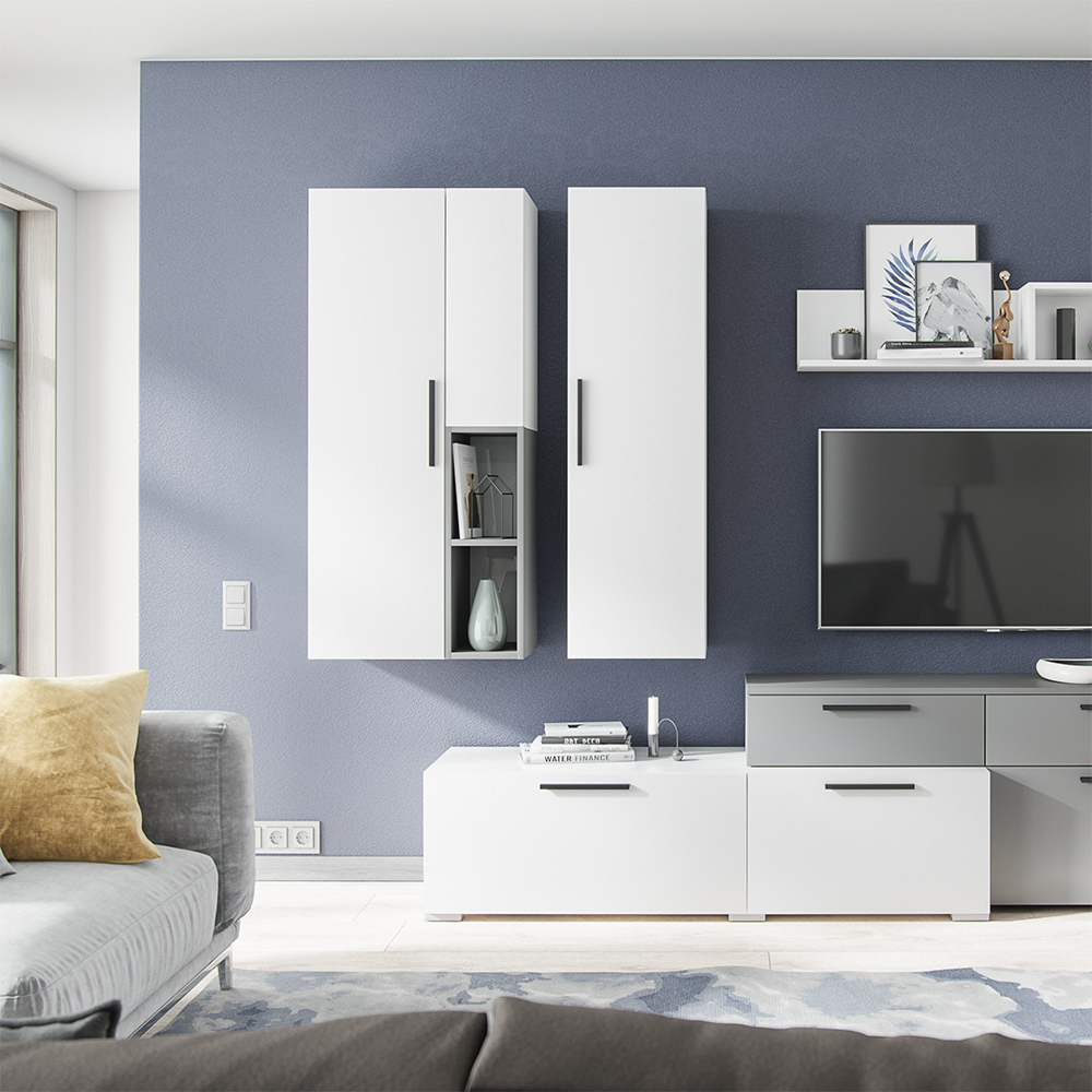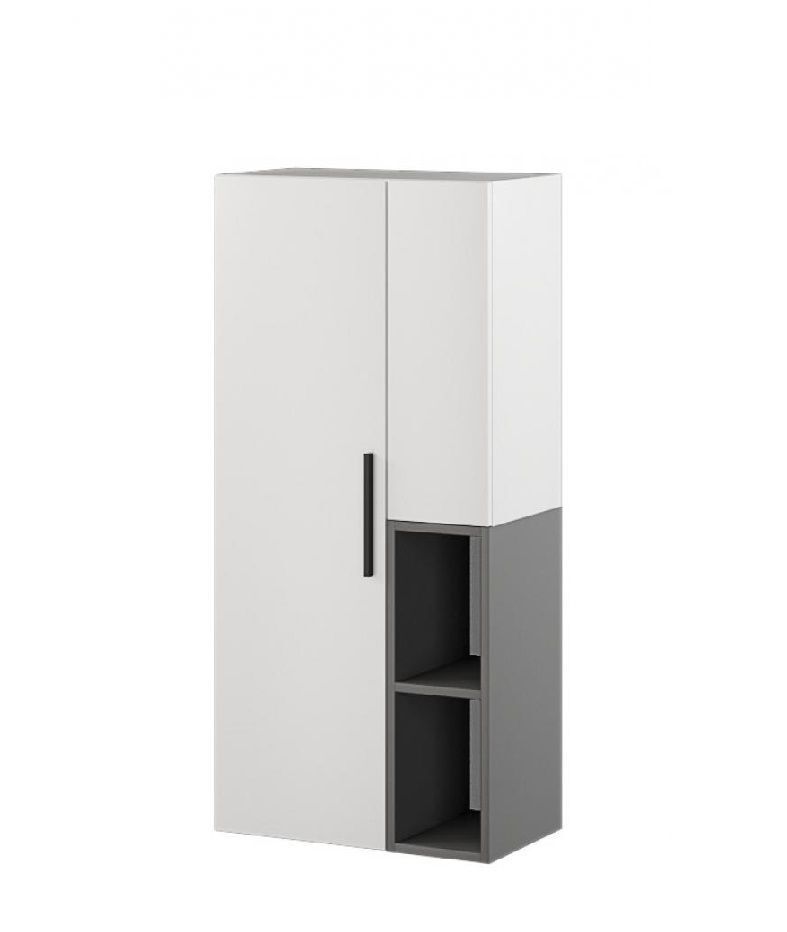 Шкаф-пенал настенный Альберо несмотря на свои размеры, очень вместительный, он позволяет хранить множество вещей, таких как одежда, книги, посуда и т.д. Оригинальное конструктивное решение с контрастной отделкой насыщенный «Графит серый» и белый с тиснением «Древесные поры». Минималистичный дизайн серии Альберо - это простые и четкие линим, без лишних декоративных элементов, что придает интерьеру современный и изысканный вид. Особенности: Корпус: ЛДСП Фасад: ЛДСП