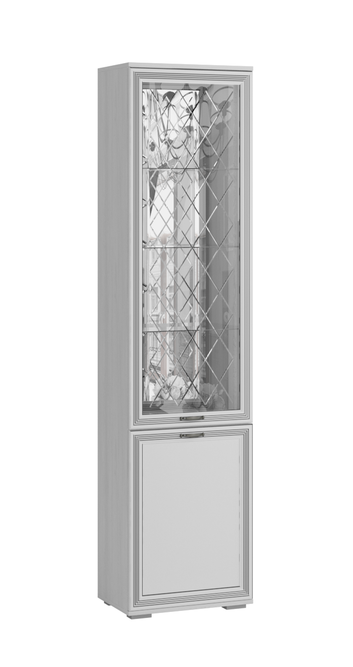 Не знаете, куда поставить сервиз в гостиной? Предлагаем Вам отличное решение - шкаф-пенал с витриной из коллекции Ливорно. Визитной карточкой модуля выступает задняя зеркальная стенка и стеклянный фасад, украшенный гравировкой в форме ромбов. Полки за глухо дверью пригодятся для тех вещей, которые лучше спрятать от лишних глаз.Данный модуль отлично сочетается с другими шкафамиЛиворно.