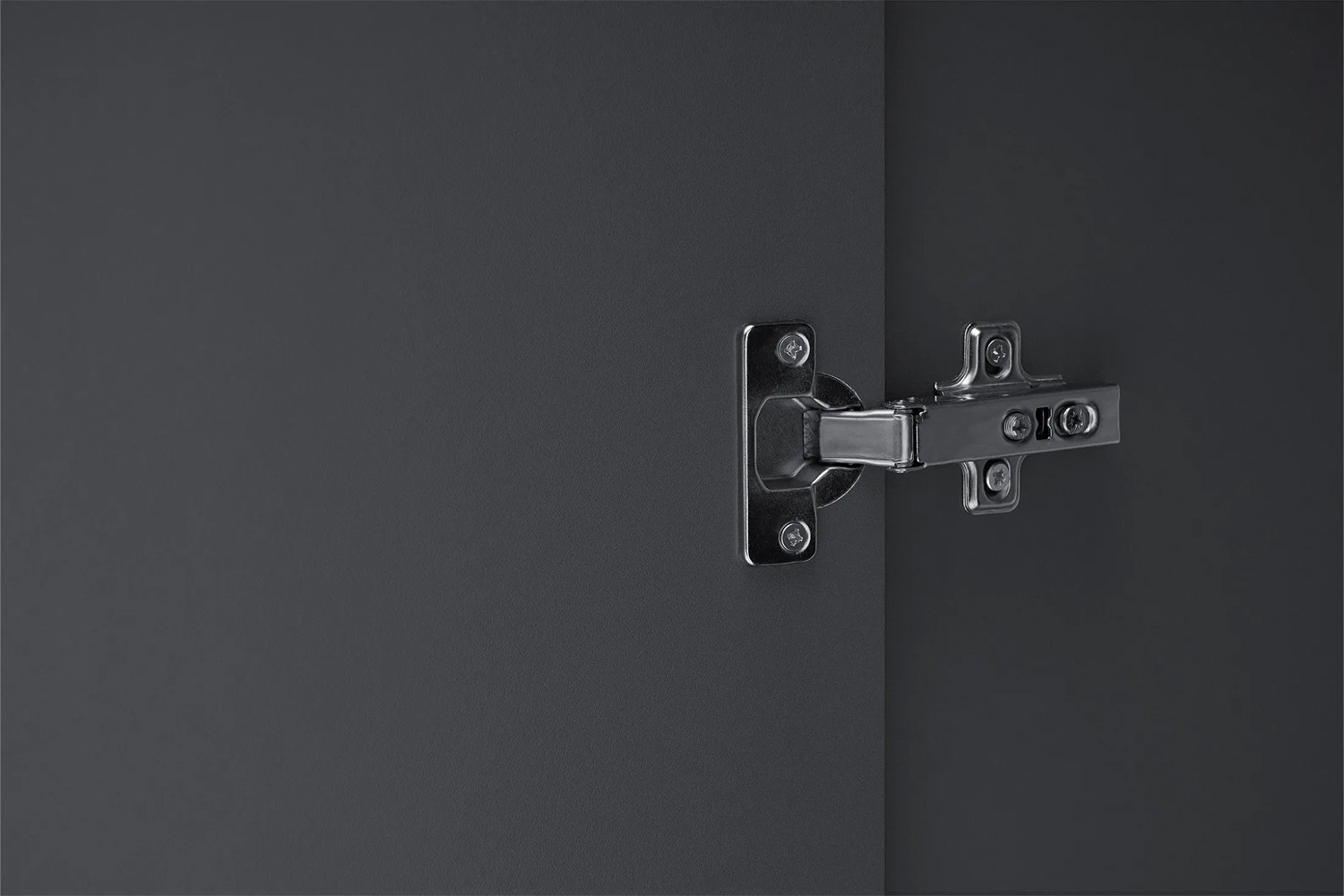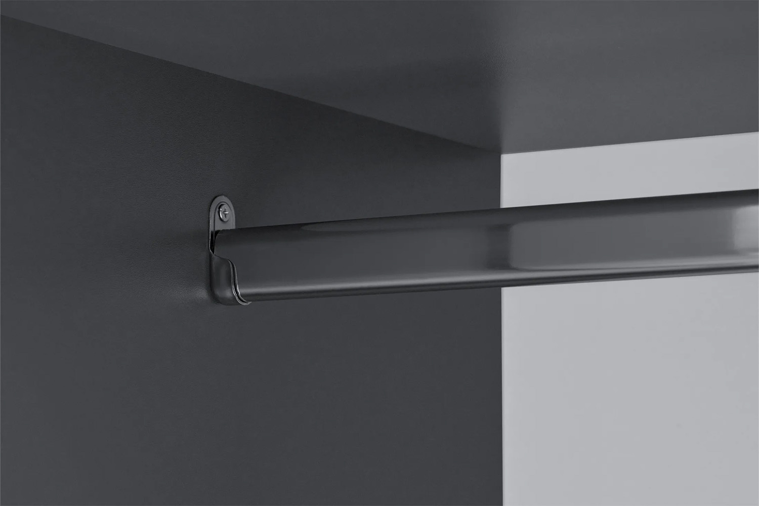 Шкаф оснащен вместительными полками, ящиками и штангой для вешалок.