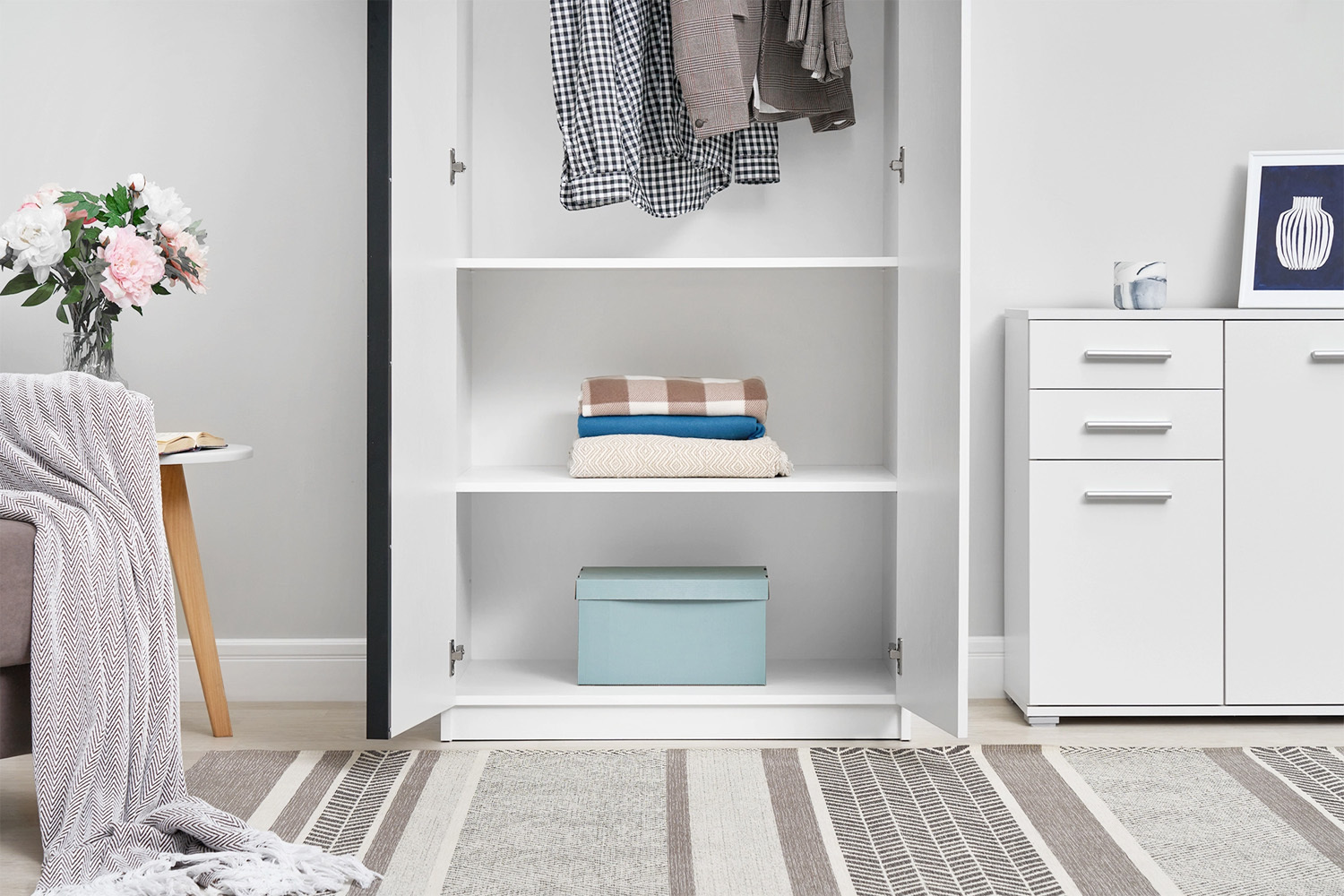 Шкаф оснащен вместительными полками и штангой для вешалок.