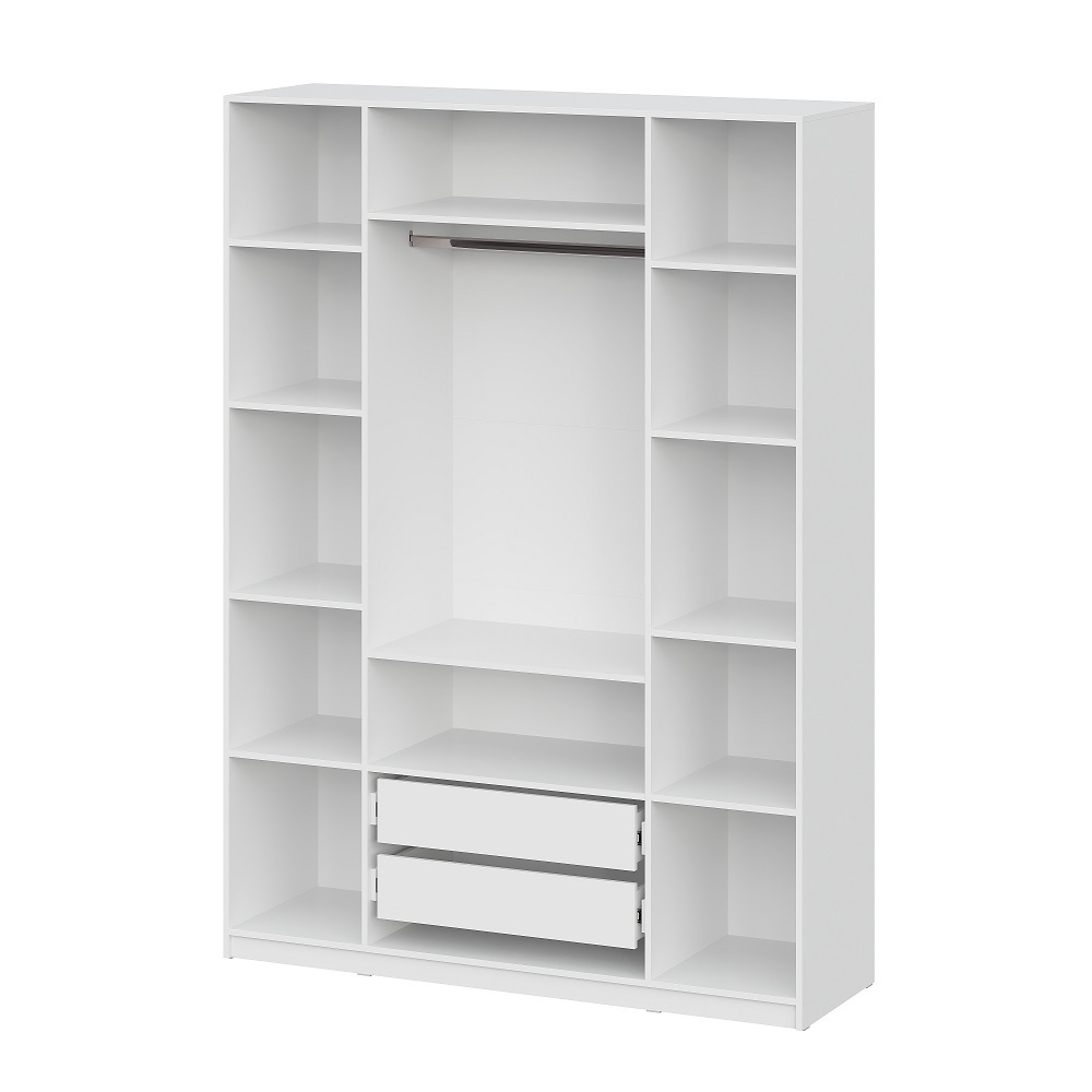 Шкаф оснащен вместительными полками, ящиками и вешалкой-штангой.
