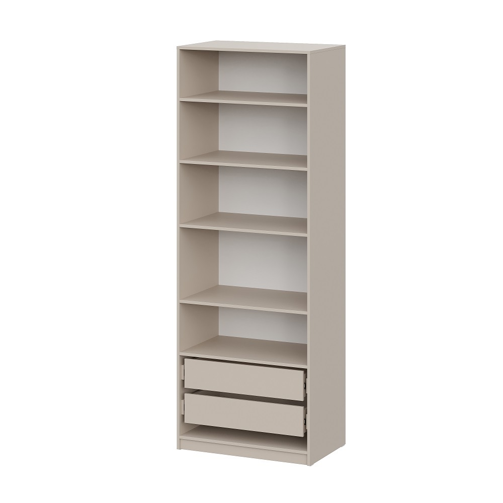 Шкаф оснащен вместительными полками и ящиками.