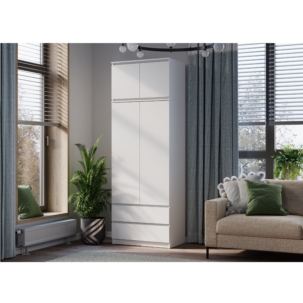 Лаконичный и многофункциональный двухстворчатый шкаф Симпл ШК-03 с антресолью дополнит современный дизайн Вашей квартиры. Большое количество полок для вещей в сложенном виде, штанга для деликатной одежды на плечиках и ящики для белья и аксессуаров помогут организовать хранение одежды в одном месте во входной зоне или спальне.