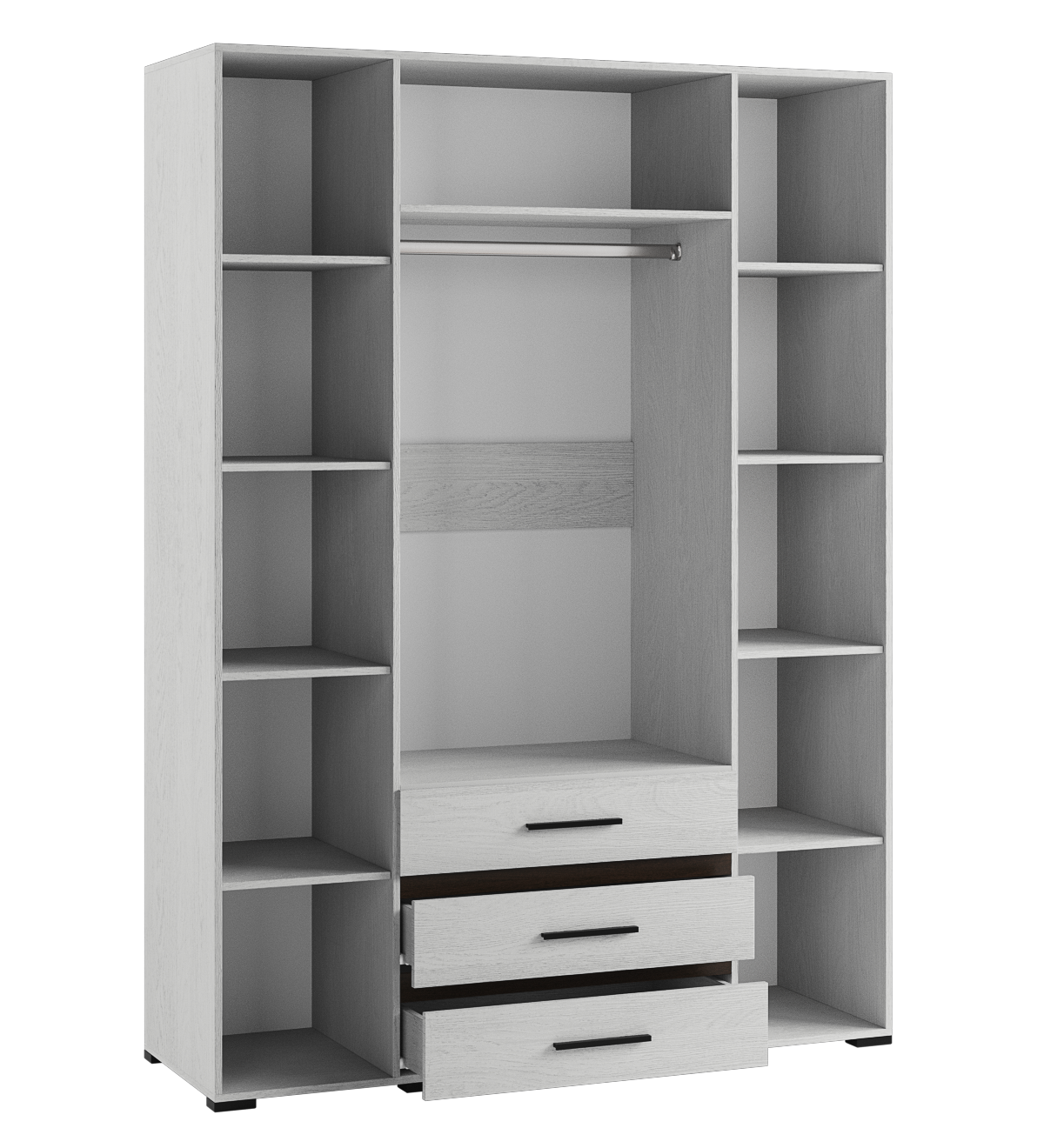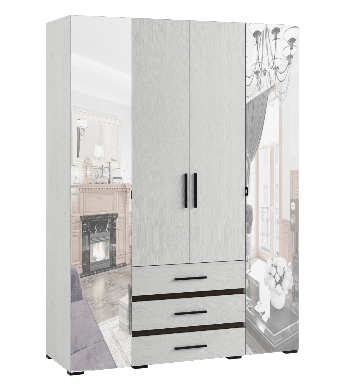 Организоваться комфортное хранение одежды и белья в спальне возможно, приобретя всего один шкаф Модена. Четырехдверный шкаф имеет две секции с полками для вещей в сложенном виде, секцию с продольной штангой для одежды на плечиках и три вместительных ящика для белья и аксессуаров. Украшают модуль зеркальные фасады, которые облегчают конструкцию шкафа и добавляют пространству легкости и "воздуха".