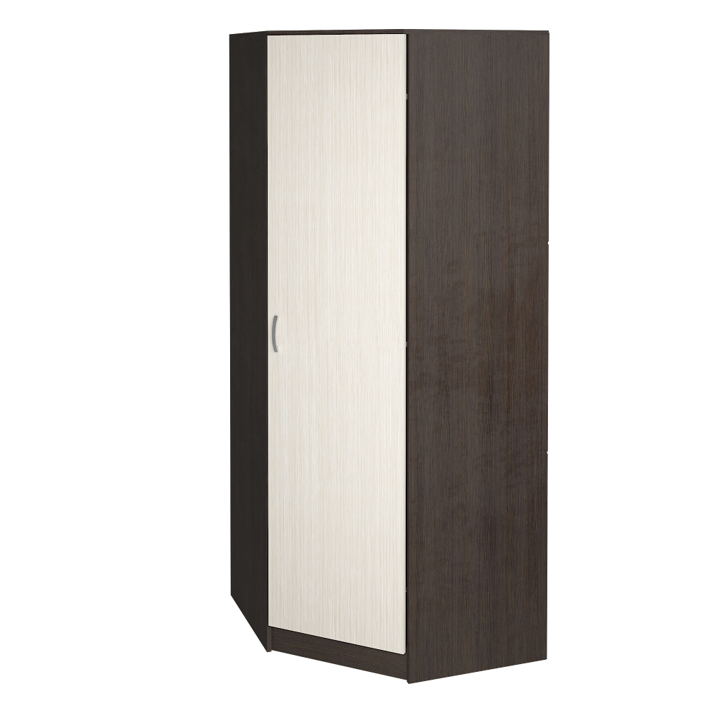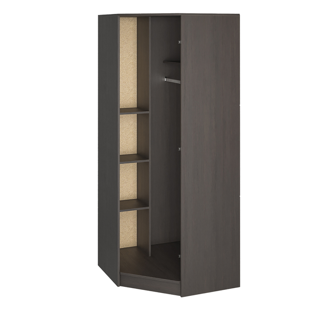 Контрастный угловой шкаф: корпус выполнен в цвете венге, а фасад – в цвете дуб белфорд. Наполнение шкафа позволит Вам с комфортом разместить одежду на плечиках на штанге и вещи в сложенном виде на полках.