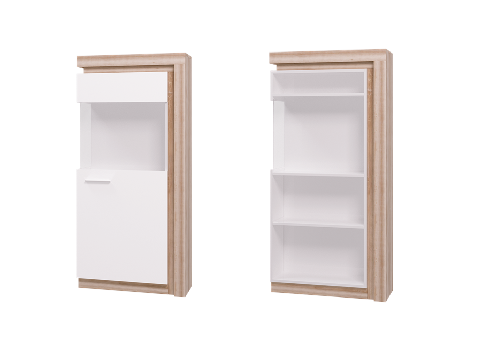 - Корпус ЛДСП 16 мм в декоре «Дуб Сакраменто» и фасад МДФ 16 мм в декоре «Белый снег глянец»