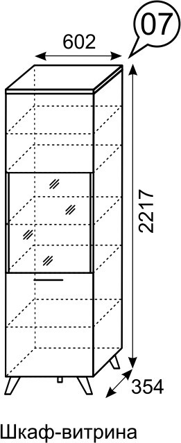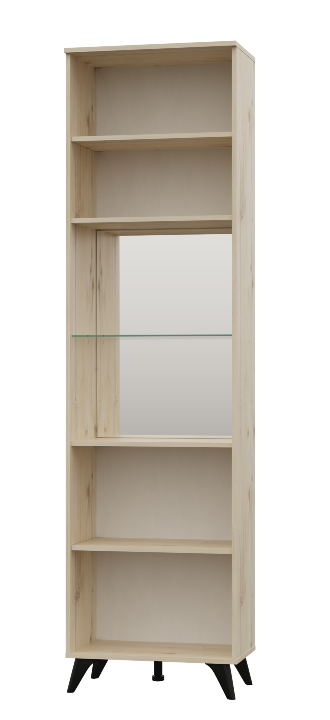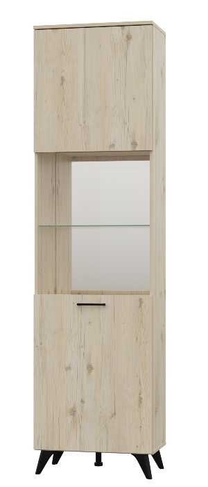 Актуальным и стильным примером шкафа-витрины в современном стиле выступает модель из коллекции Sofia. Шкаф выполнен из высококлассного ЛДСП в декоре "гаскон пайн светлый" и украшен черными ножками и ручкой. Освежает и визуально облегчает конструкцию шкафа стеклянная вставка на фасаде. Наполнение- набор деревянных и одна стеклянная полка. Модуль идеален для хранения сервиза, предметов декора, памятных вещиц и книг.