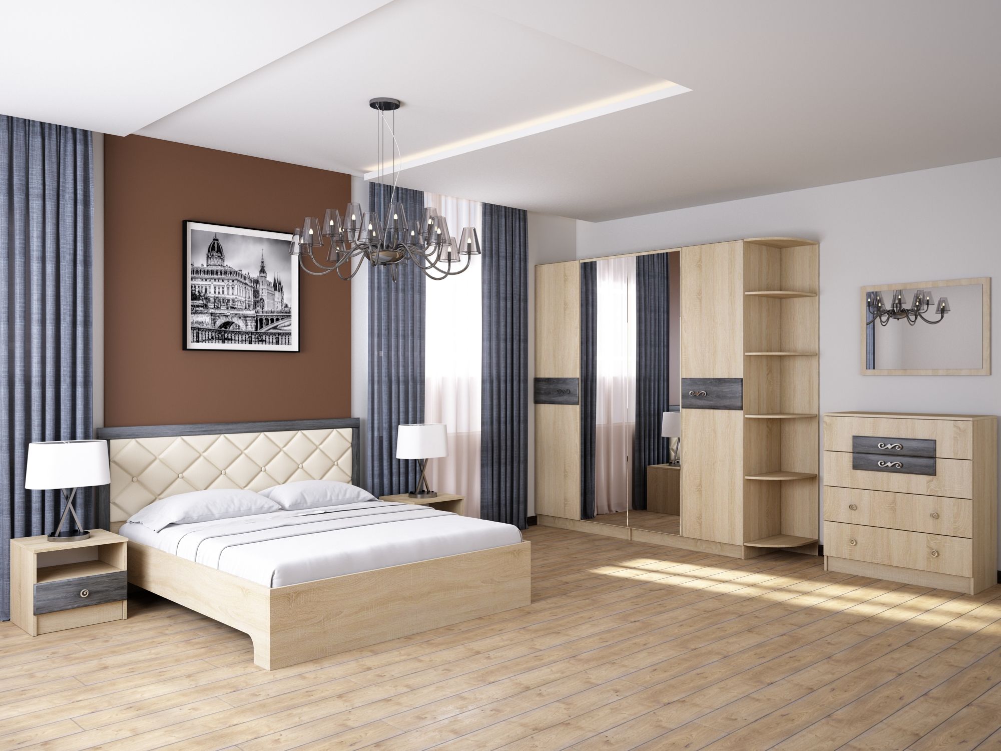 - стильное и функциональное решение для организации пространства спальни. Мебель выполнена из ЛДСП в декоре дуб сонома и украшена вставками из МДФ цвета дуб шале серебро. Утонченные ручки являются несомненным украшением модулей. Мягкое изголовье кровати обтянуто экокожей со строчкой и декоративными пуговицами. Кровать комплектуется основанием, матрас приобретается отдельно.Особенностиактуальный стильуниверсальная цветовая гаммаизящная фурнитуракомбинированные зеркалом фасады шкафовразноплановое наполнение модулеймягкое изголовье, декорированное экокожей с пуговицамиоснование кровати в комплекте