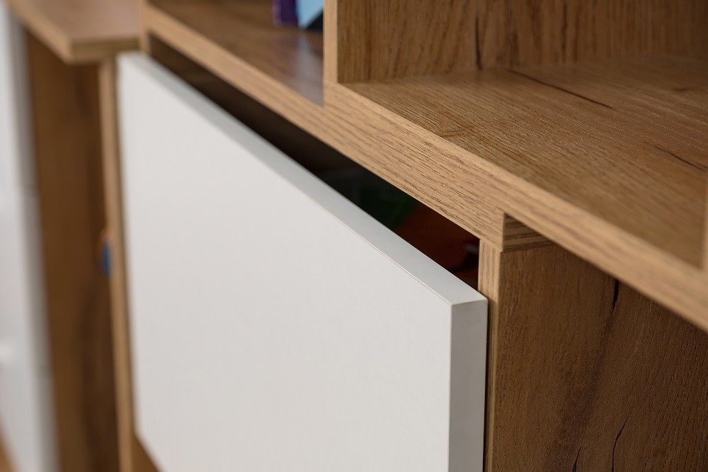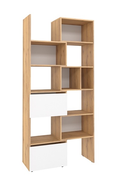 Уникальный в своем роде стеллаж-трансформер выступает визитной карточкой коллекции Лойс. Модуль раздвигает и сдвигается обратно, меняя свою ширину от 989 до 560 мм. Вы можете установить стеллаж автономно или же комплектовать с другими шкафами серии. Для максимальной безопасности секции стеллажа фиксируются между собой на межсекционные стяжки.