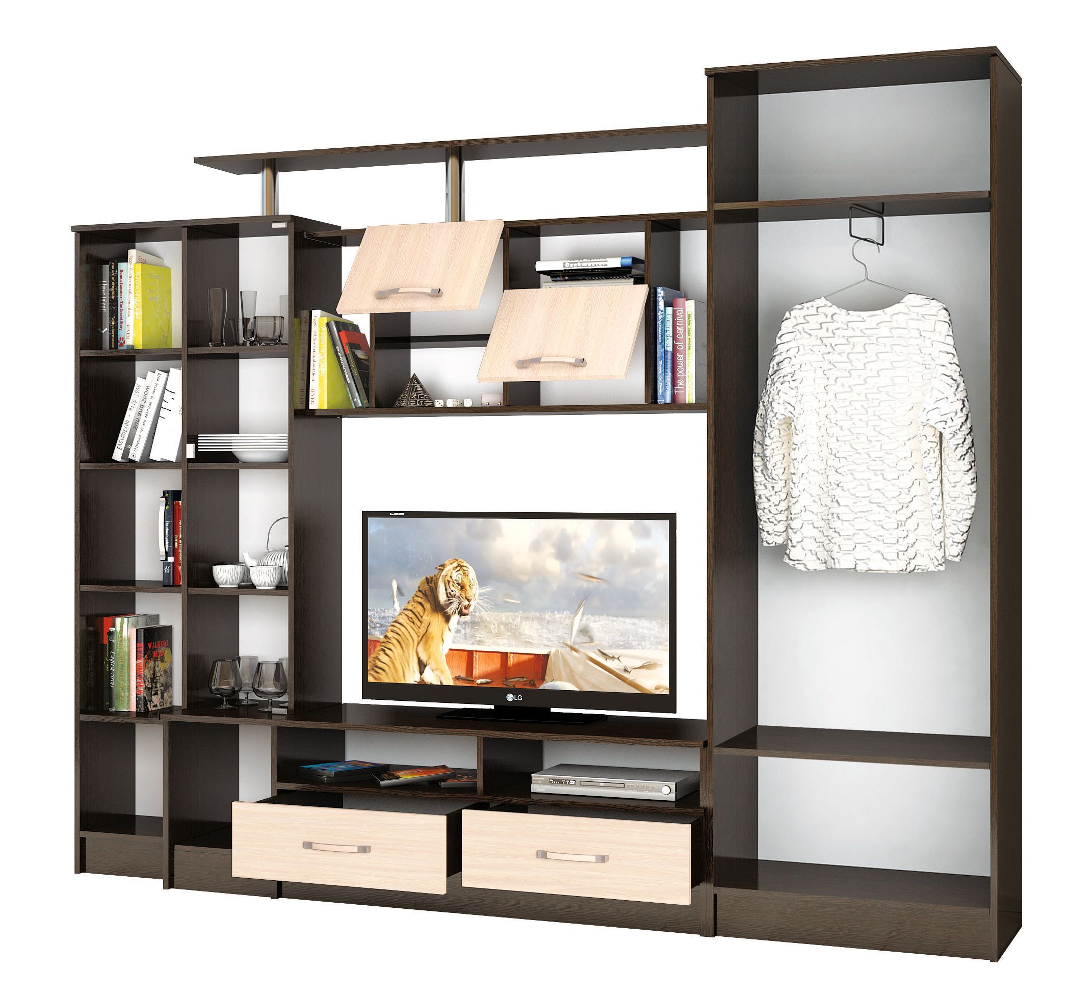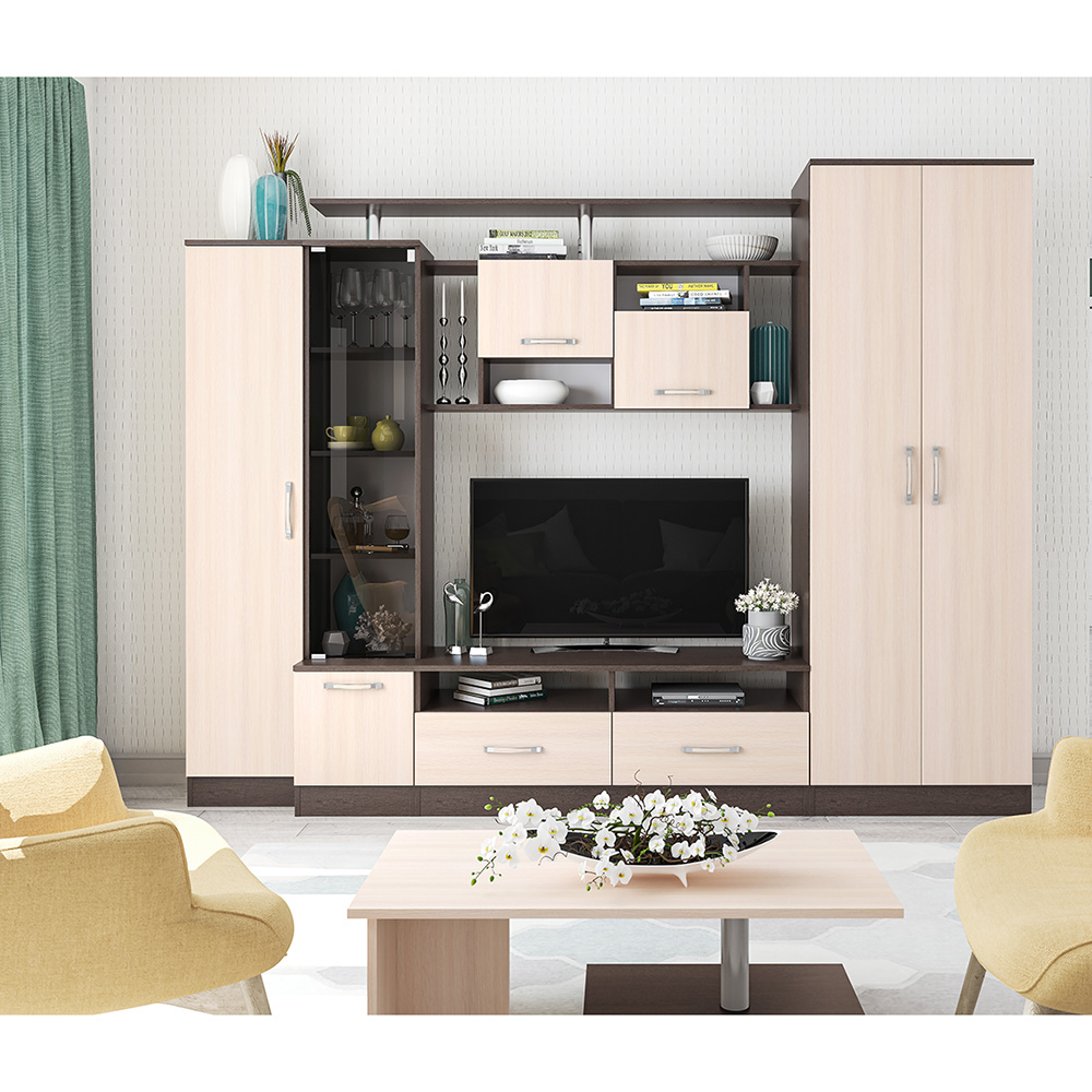 ГостинаяОскар 5обладает отличной функциональностью и комфортом при ежедневной эксплуатации. Эти необходимые свойства обеспечивает наличие нескольких вместительных секций, позволяющих с удобством разместить все нужные вещи. Продуманное цветовое решение мебели гарантирует ее совместимость с практически любым современным интерьером.