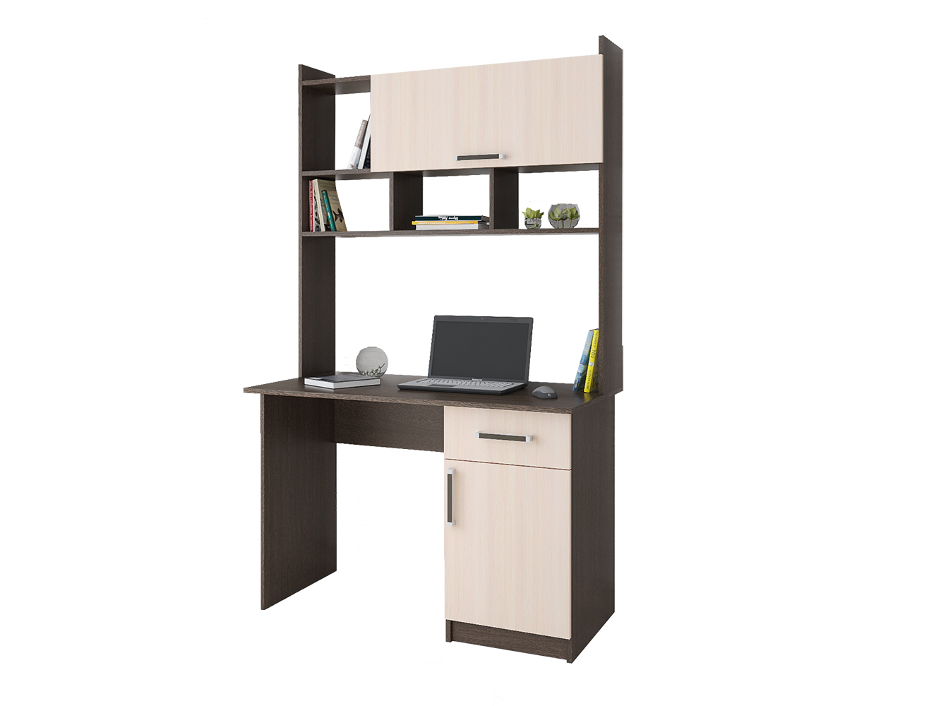 Компьютерный стол Квартет-10 - модуль, продуманный до мелочей и созданный для Вашего максимального комфорта в процессе работы или учебы дома. Прямоугольная столешница, надстройка с открытой и закрытой полками и тумба - все, чтобы обеспечить удобное и грамотное хранение на рабочем месте. Приятный декор с имитацией текстуры натурального дерева придется по душе любителям эко-стиля в интерьере.