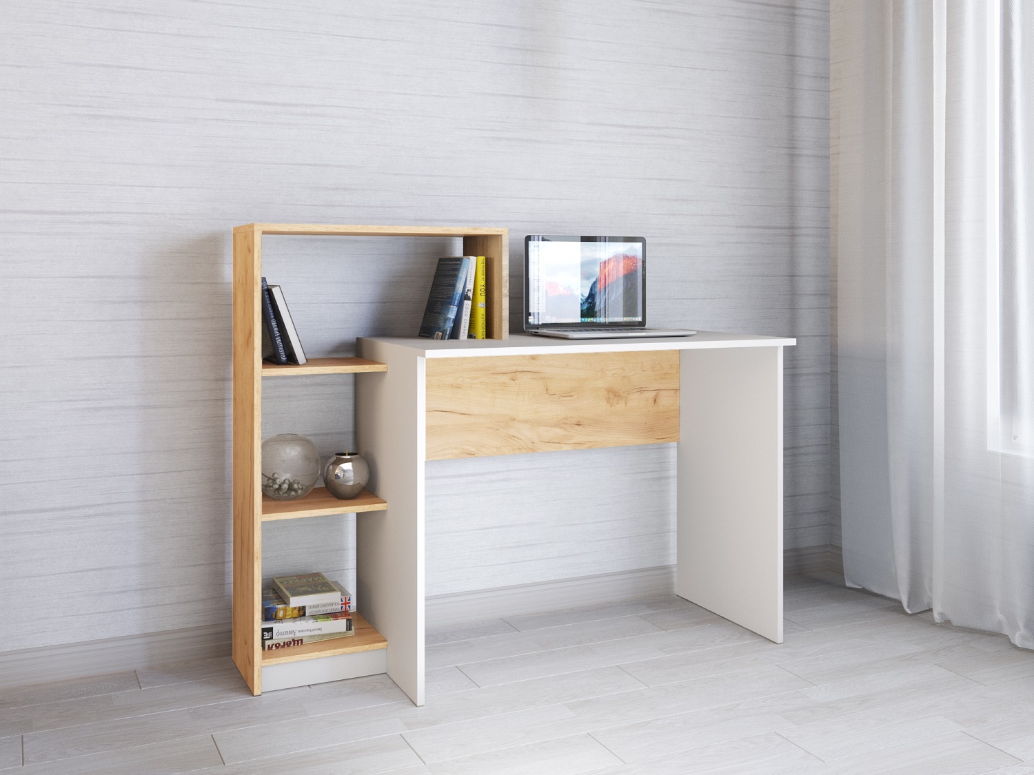 Компьютерный стол Квартет-2 сочетает в себе преимущества просторного письменного стола и вместительного стеллажа, превращаясь тем самым в полноценное рабочее место. На столе хватит места для ноутбука и настолько лампы, а на открытых полках - для книг, канцелярии и различных мелочей, которые необходимо иметь под рукой во время рабочего процесса. Пластиковые подпятники на опорах защитят напольное покрытие от деформации и царапин.