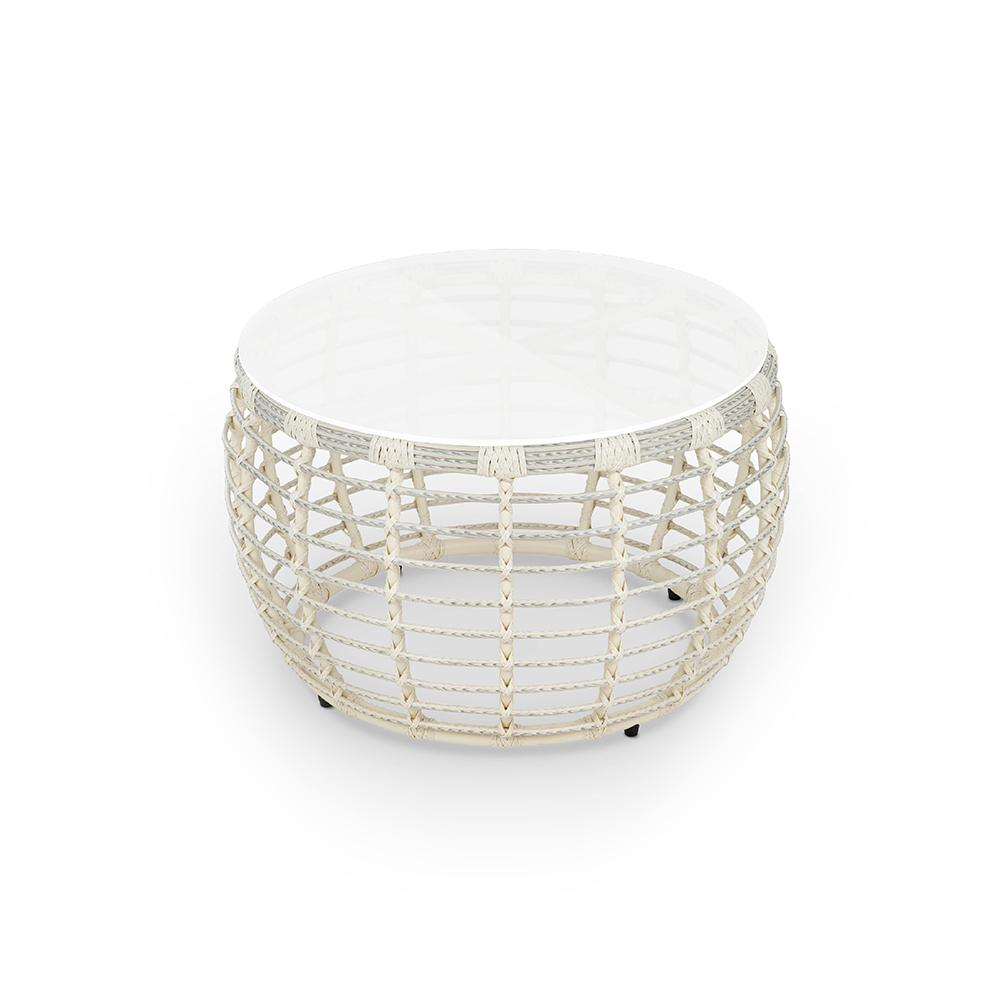 Небольшой кофейный стол с утончёнными пропорциями. Прозрачная столешница из стекла подчёркивает декоративное плетение основания, создавая игру света и объёма. Подходит для размещения рядом с креслом или диваном.