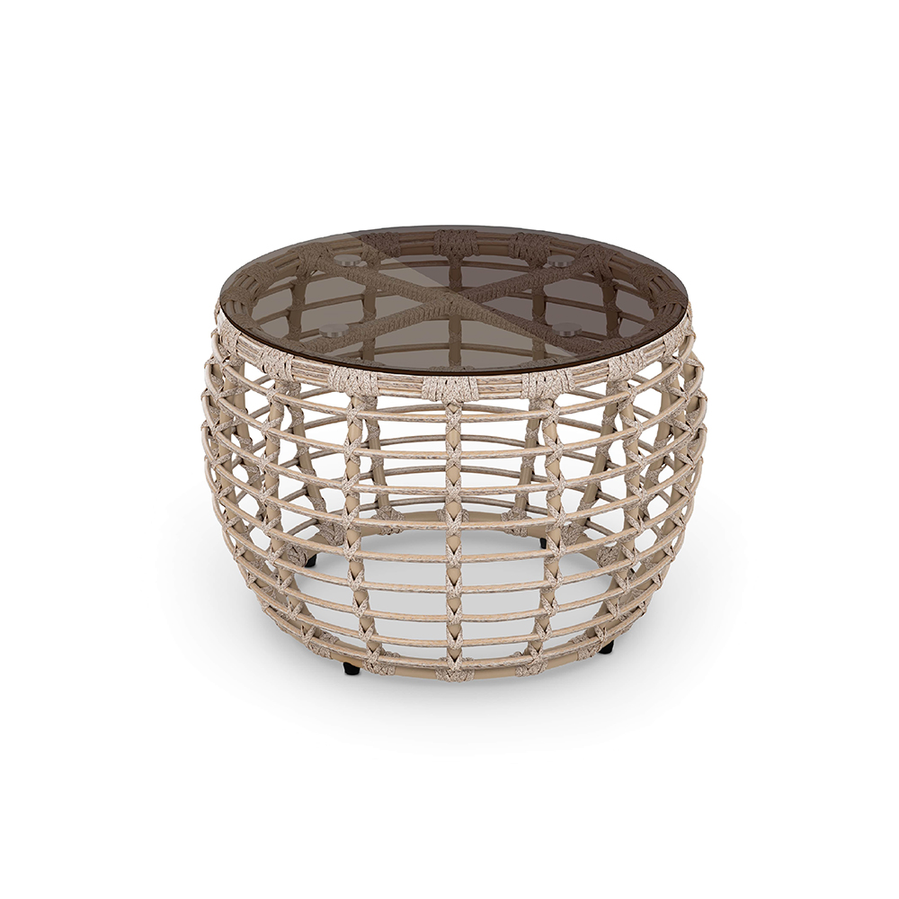 Небольшой кофейный стол с утончёнными пропорциями. Прозрачная столешница из стекла подчёркивает декоративное плетение основания, создавая игру света и объёма. Подходит для размещения рядом с креслом или диваном.