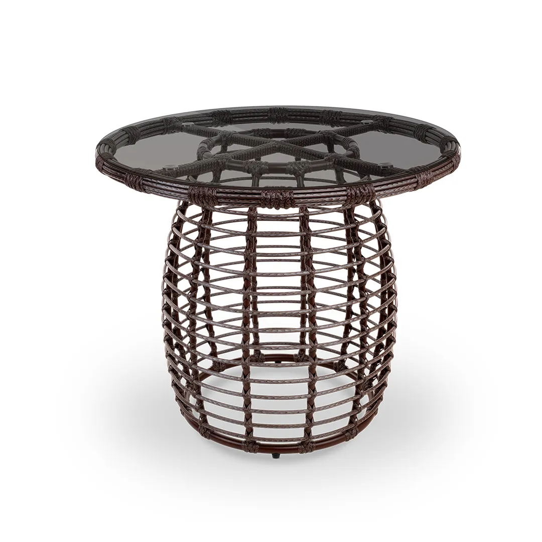 Небольшой кофейный стол с утончёнными пропорциями. Прозрачная столешница из стекла подчёркивает декоративное плетение основания, создавая игру света и объёма. Подходит для размещения рядом с креслом или диваном.