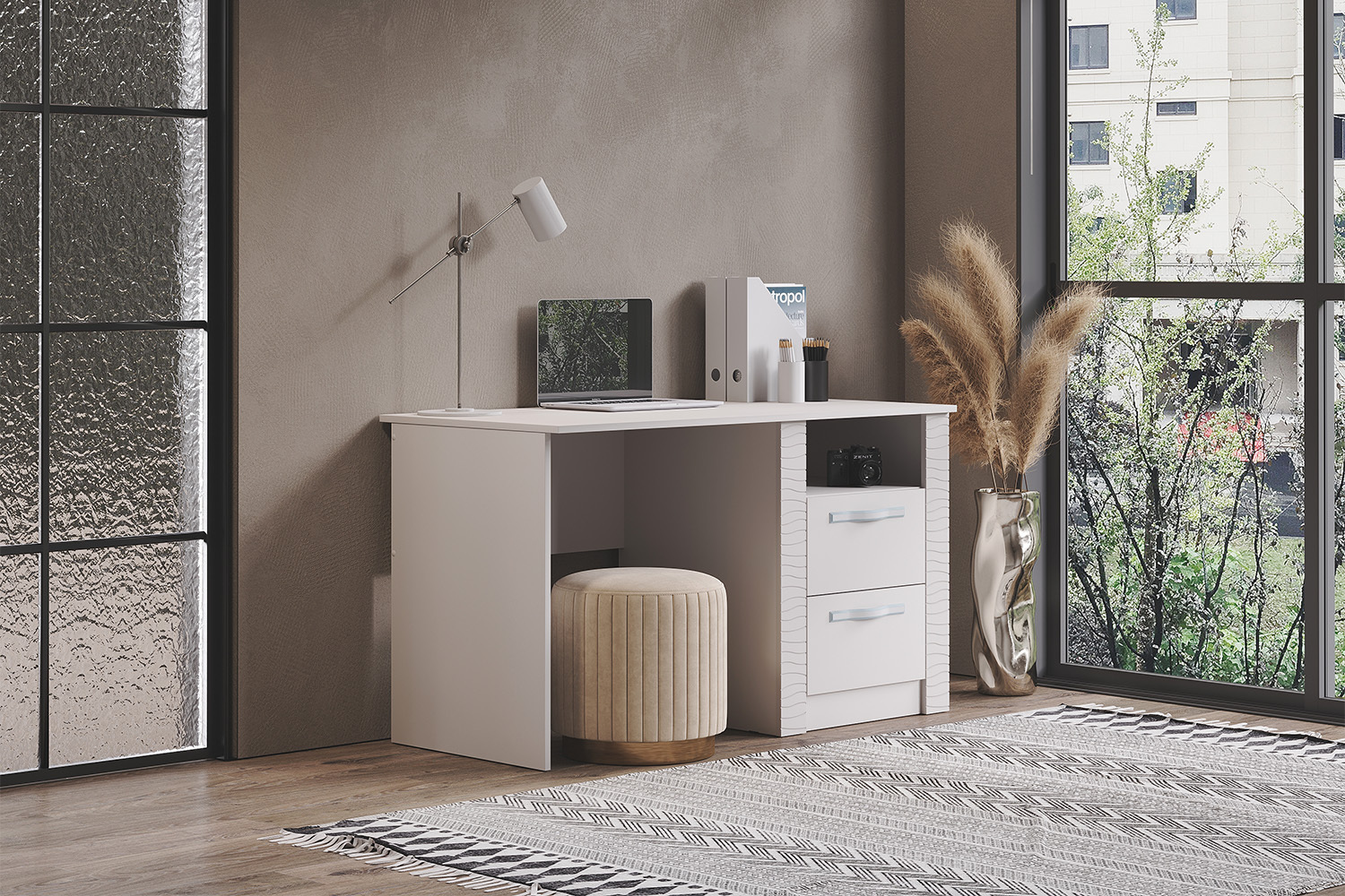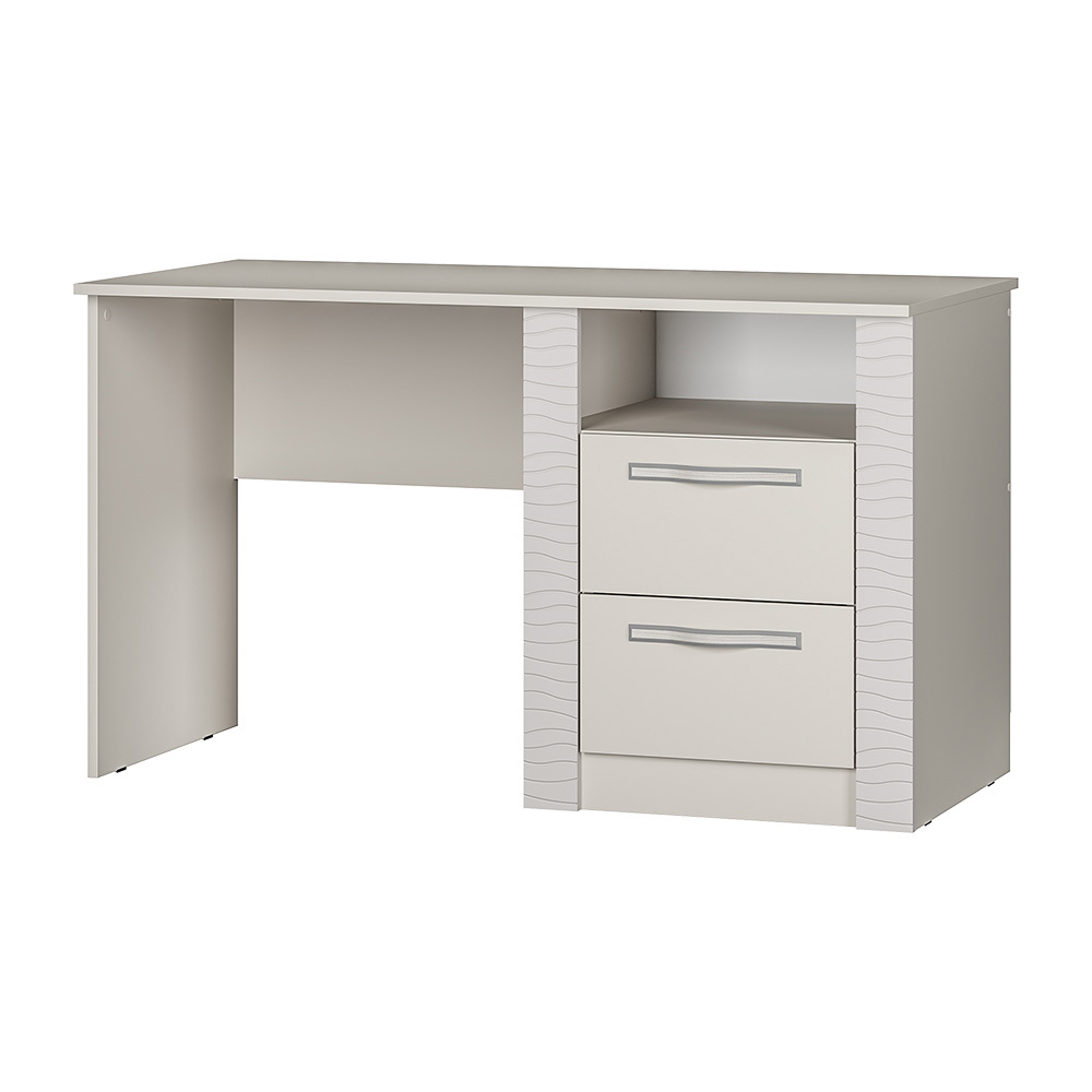 Стильный письменный стол "Монако" станет любимым местом для работы или учебы. Модель выполнена из высококачественной ЛДСП в цвете "кашемир". Фасады встроенной тумбы имеют отделку из МДФ. Помимо вместительной столешницы, в столе есть два выдвижных ящика и открытая ниша для хранения всех необходимых вещей.