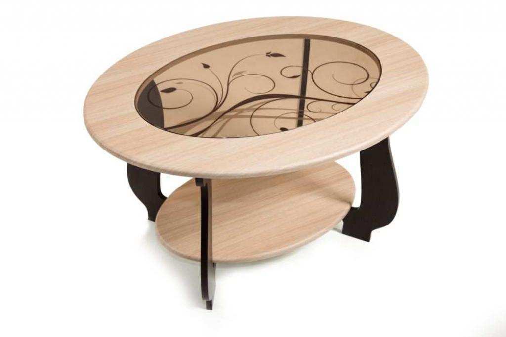 Столешницы овальные, верхняя со стеклянной вставкой с рисунком.