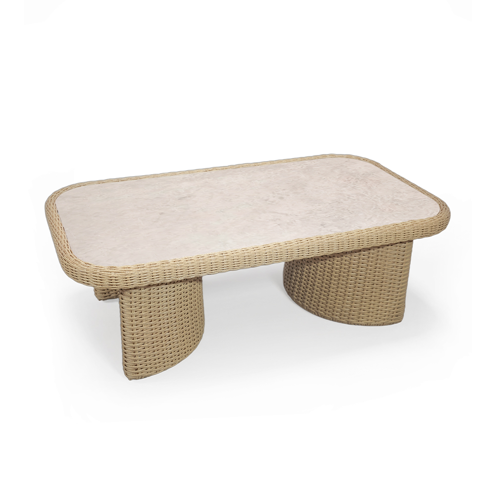 Изящные ножки, выполненные в форме полумесяцев, обращены окружностями к центру, создавая эффект легкого, парящего объема. Этот дизайн вносит в интерьер террасы или гостиной динамику и скрытый символ бесконечного движения. Прямоугольная столешница из премиального керамогранита контрастирует с плавными линиями основания, добавляя композиции завершенность. Вместе с мягкими линиями кресел и дивана ТЕМПО, этот столик становится не просто функциональным предметом, а настоящим скульптурным центром вашего пространства для отдыха.