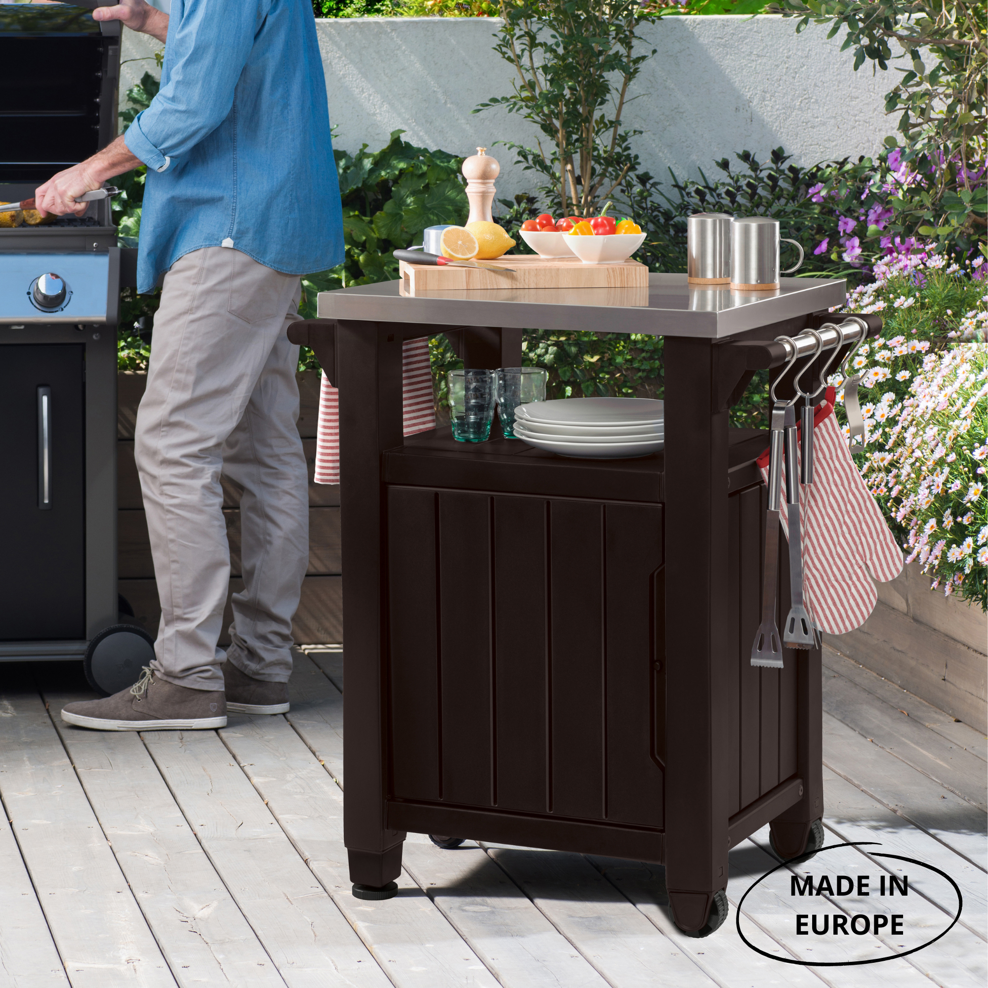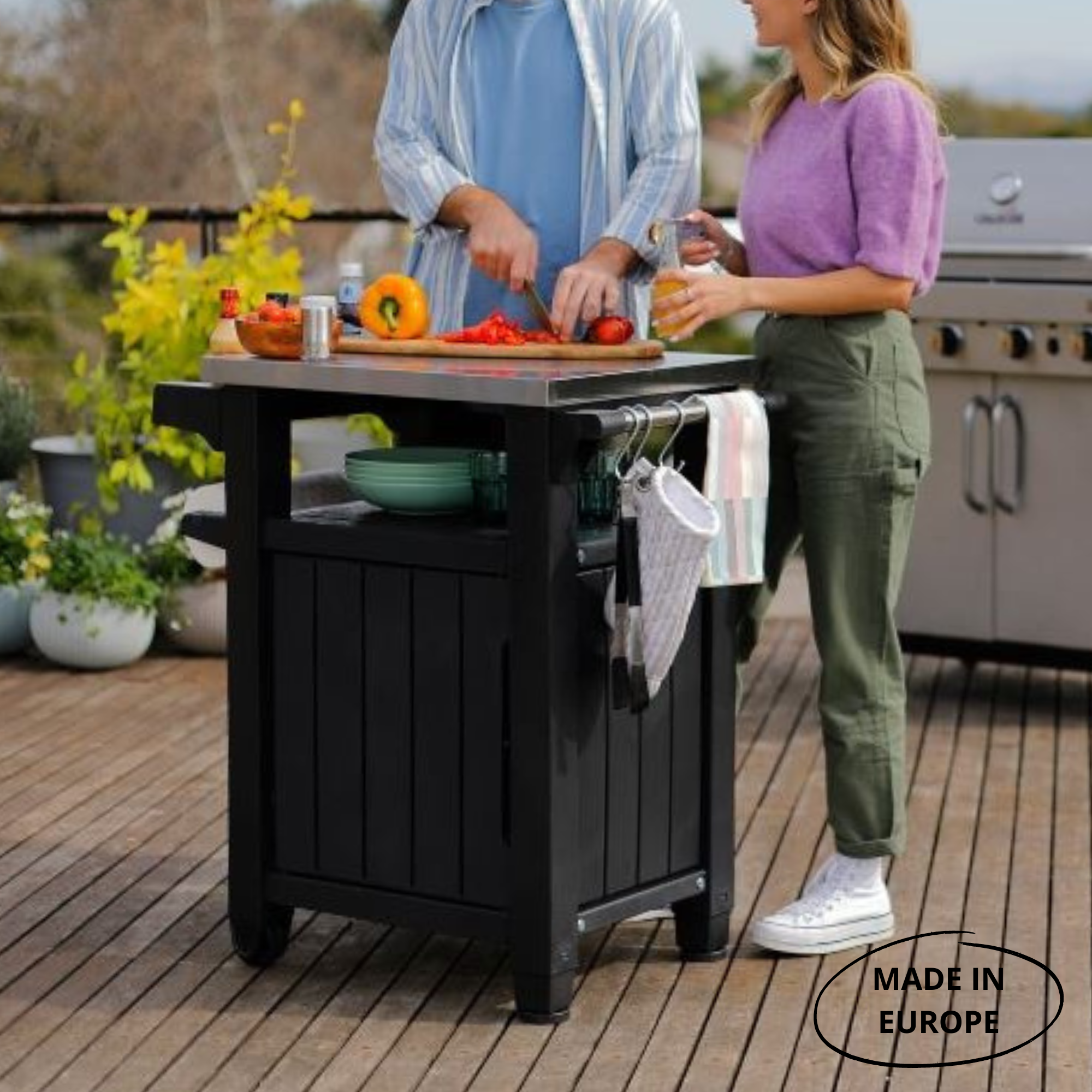 Функциональное и оригинальное решение в прекрасном стиле, такое как стол для гриля, украсит любой сад или террасу. Основным преимуществом продукта является его мультифункциональность. Необычная конструкция позволяет использовать его, как стол для приготовления блюд, и как шкафчик для хранения различных продуктов и ингредиентов. Столик оснащен столешницей из нержавеющей стали, удобной ручкой с дополнительными вешалками и колесиками, благодаря которым продукт удобно перемещать в разные места. Во вместительный шкафчик можно положить подручные аксессуары, необходимые для приготовления и подачи блюд на свежем воздухе.