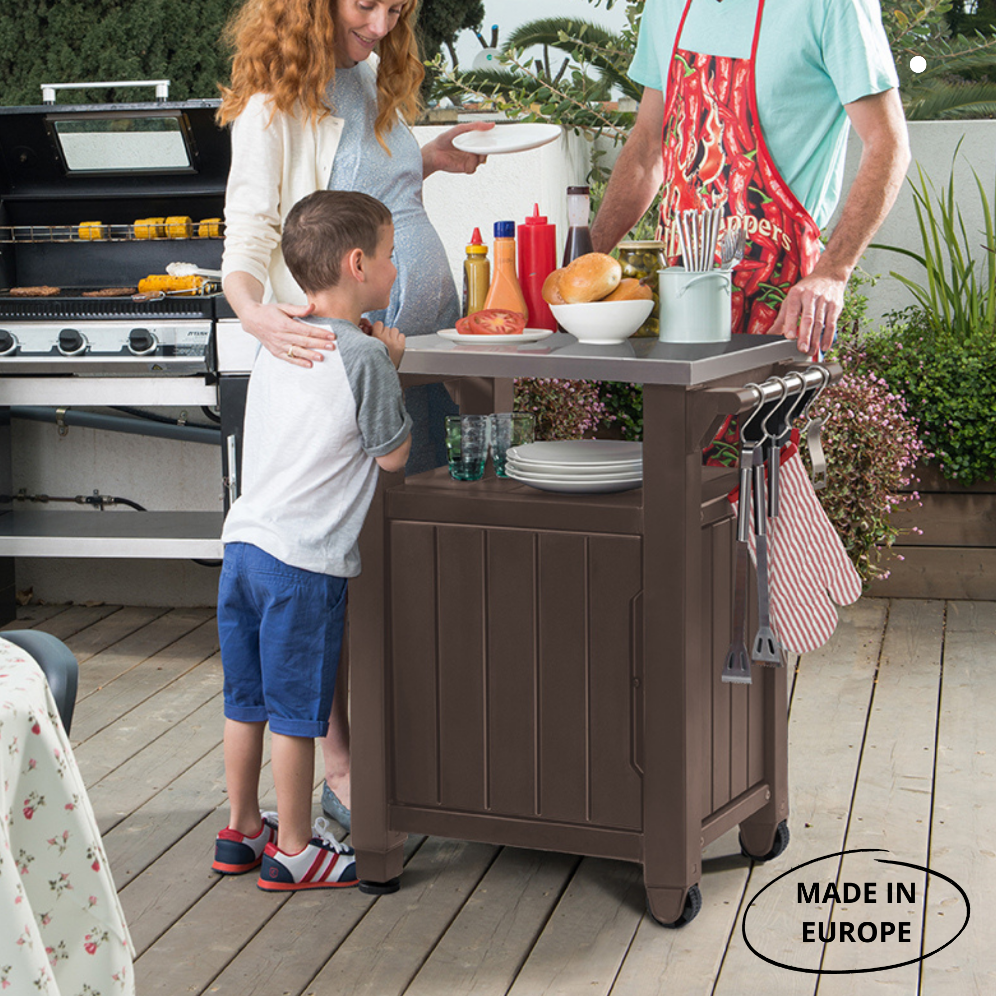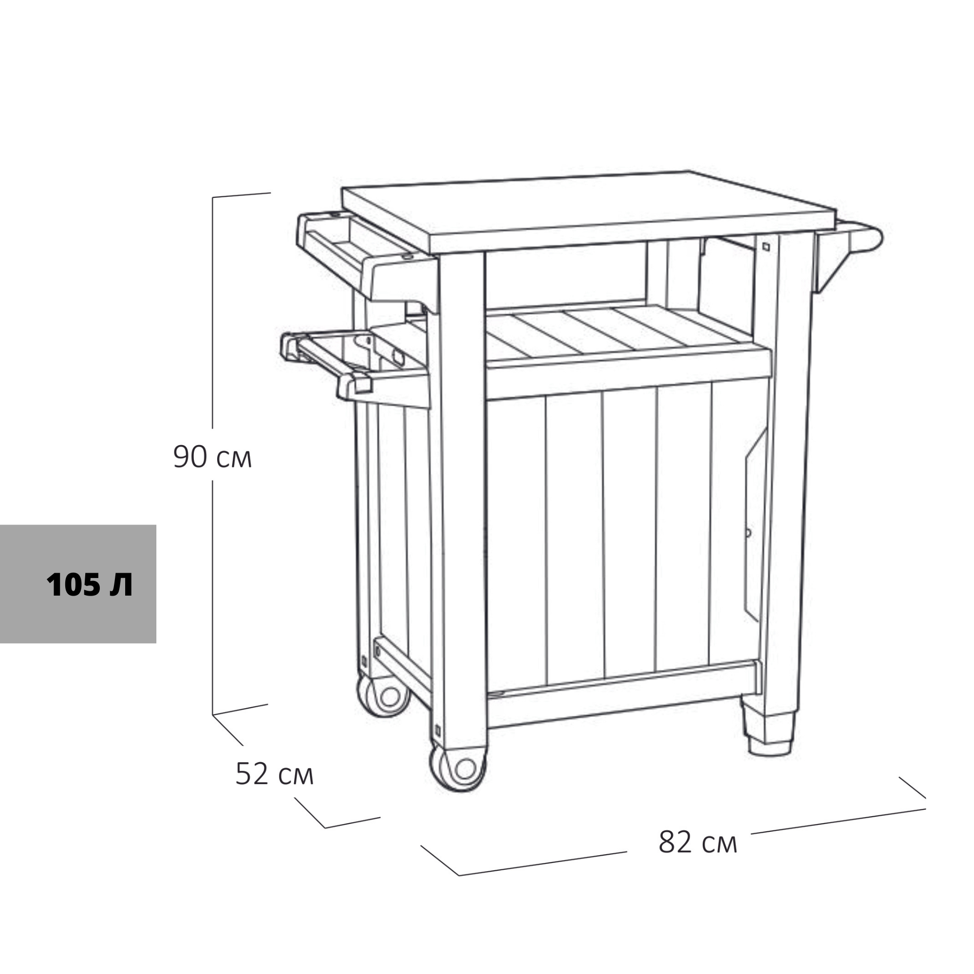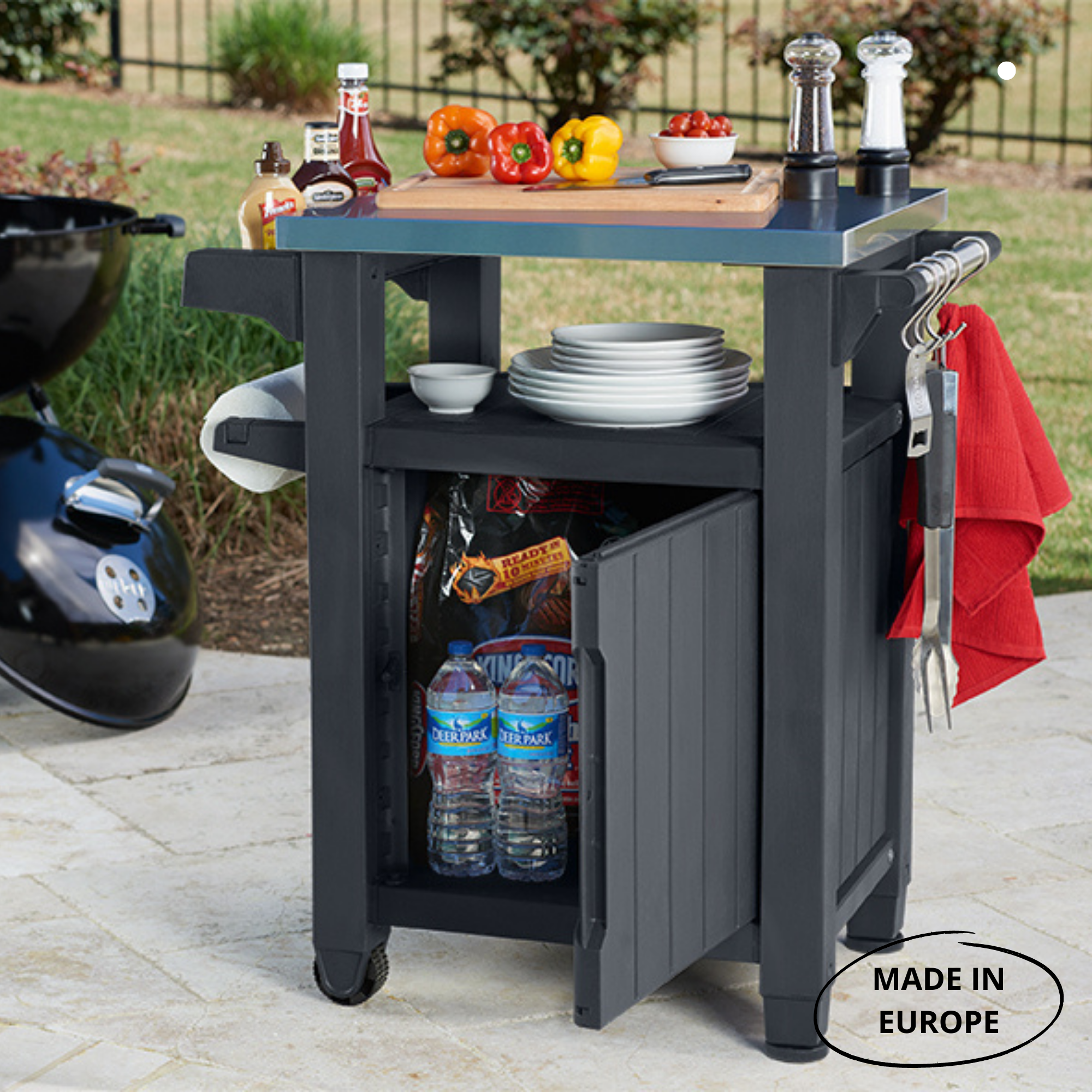 Функциональное и оригинальное решение в прекрасном стиле, такое как стол для гриля, украсит любой сад или террасу. Основным преимуществом продукта является его мультифункциональность. Необычная конструкция позволяет использовать его, как стол для приготовления блюд, и как шкафчик для хранения различных продуктов и ингредиентов. Столик оснащен столешницей из нержавеющей стали, удобной ручкой с дополнительными вешалками и колесиками, благодаря которым продукт удобно перемещать в разные места. Во вместительный шкафчик можно положить подручные аксессуары, необходимые для приготовления и подачи блюд на свежем воздухе.