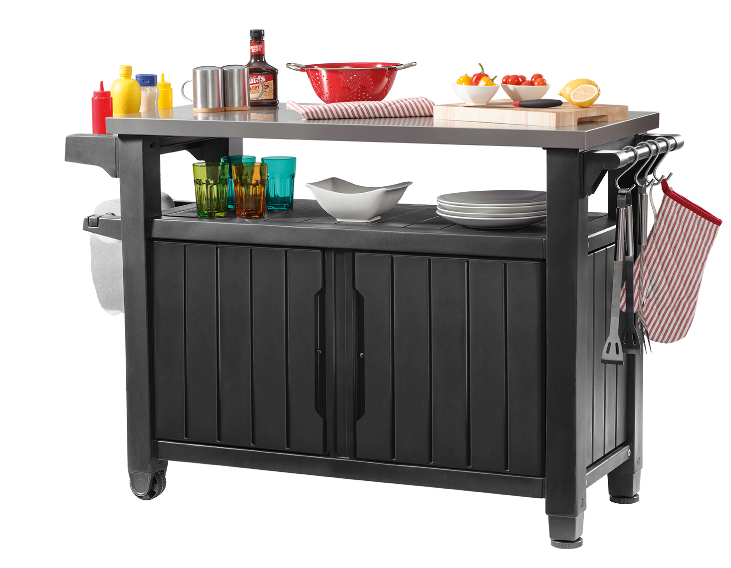 Функциональное и оригинальное решение в прекрасном стиле, такое как стол для гриля, украсит любой сад или террасу. Основным преимуществом продукта является его мультифункциональность. Необычная конструкция позволяет использовать его, как стол для приготовления блюд, и как шкафчик для хранения различных продуктов и ингредиентов. Столик оснащен столешницей из нержавеющей стали, удобной ручкой с дополнительными вешалками и колесиками, благодаря которым продукт удобно перемещать в разные места. Во вместительный шкафчик можно положить подручные аксессуары, необходимые для приготовления и подачи блюд на свежем воздухе.