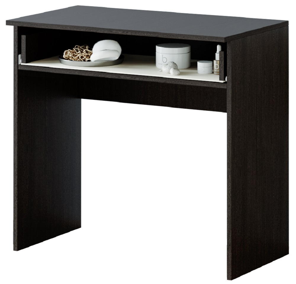 Стол оснащён выдвижным ящиком, который служит удобным местом для хранения косметики, аксессуаров и средств по уходу. Благодаря светлым фасадам и текстуре обработанной древесины дуба в сочетании с контрастными элементами цвета венге, этот стол гармонично впишется в любой интерьер.