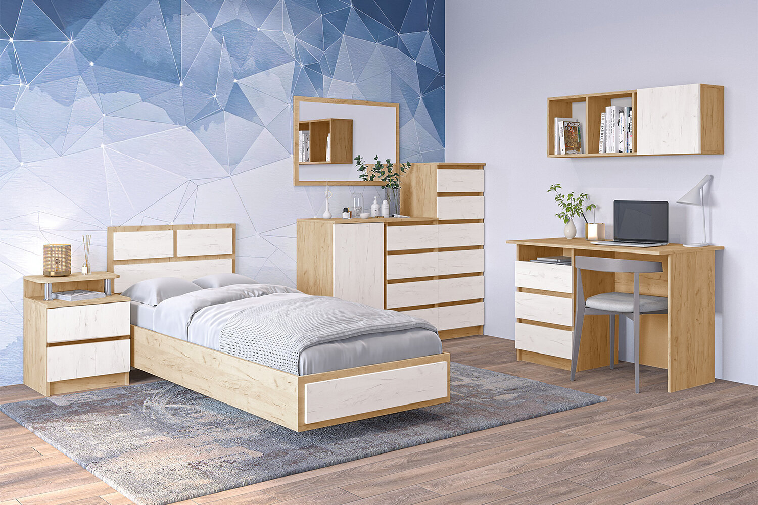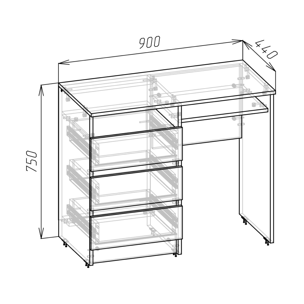 Туалетный столик из модульной коллекции Зара в отделке дуб золотой крафт/крафт белый прекрасно впишется в современный интерьер Вашей квартиры. Модель оснащена тремя выкатными ящиками, просторной столешницей и открытой нишей.