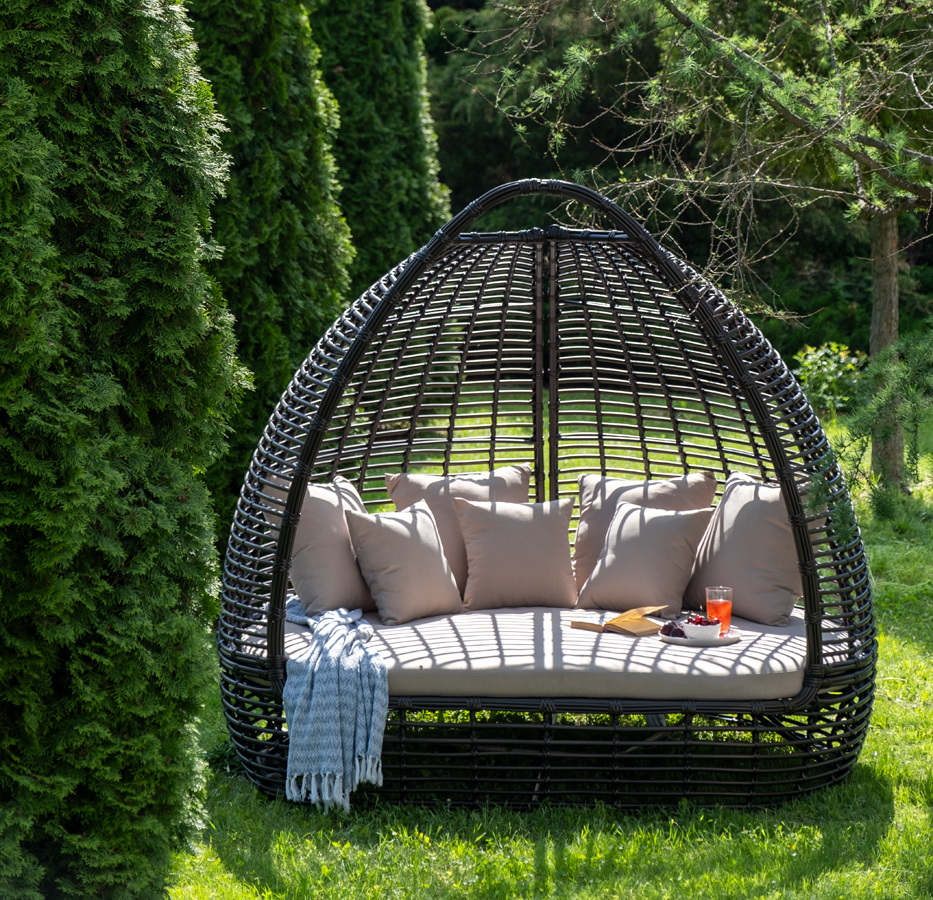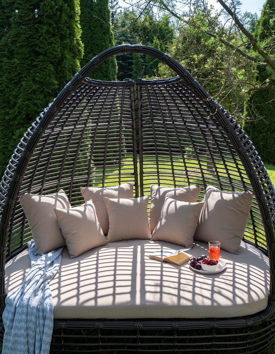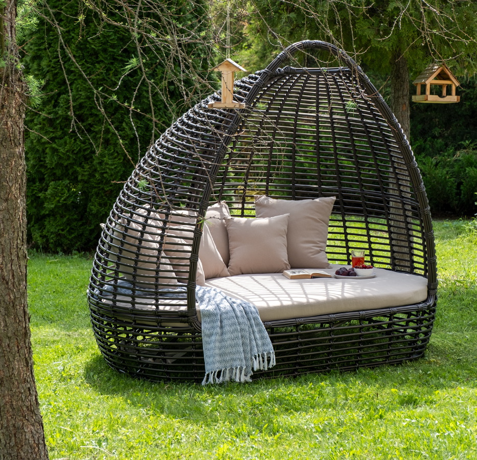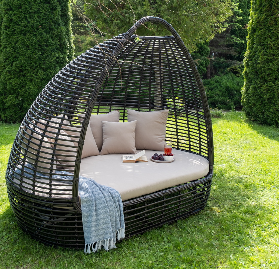 Функциональная полукруглая кровать выполнена плетением вручную из искусственного ротанга. Конструкция усилена алюминиевым каркасом.