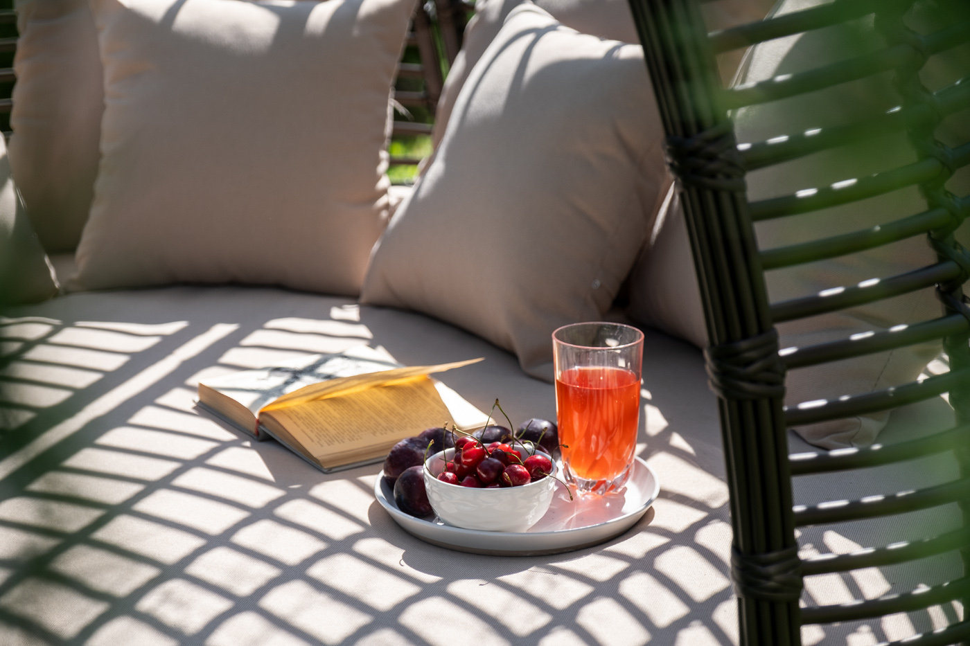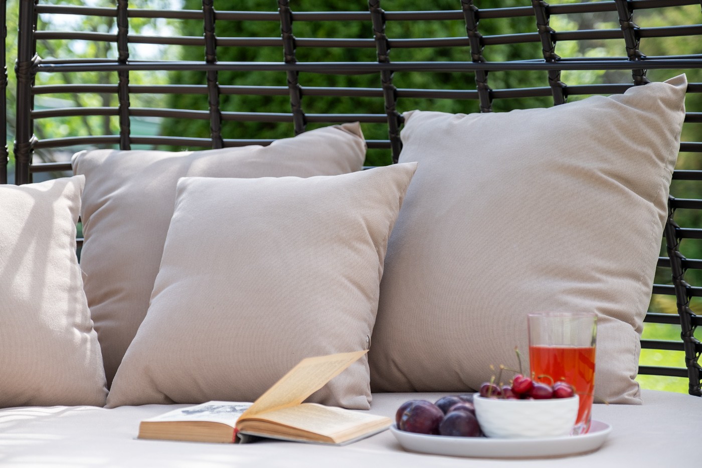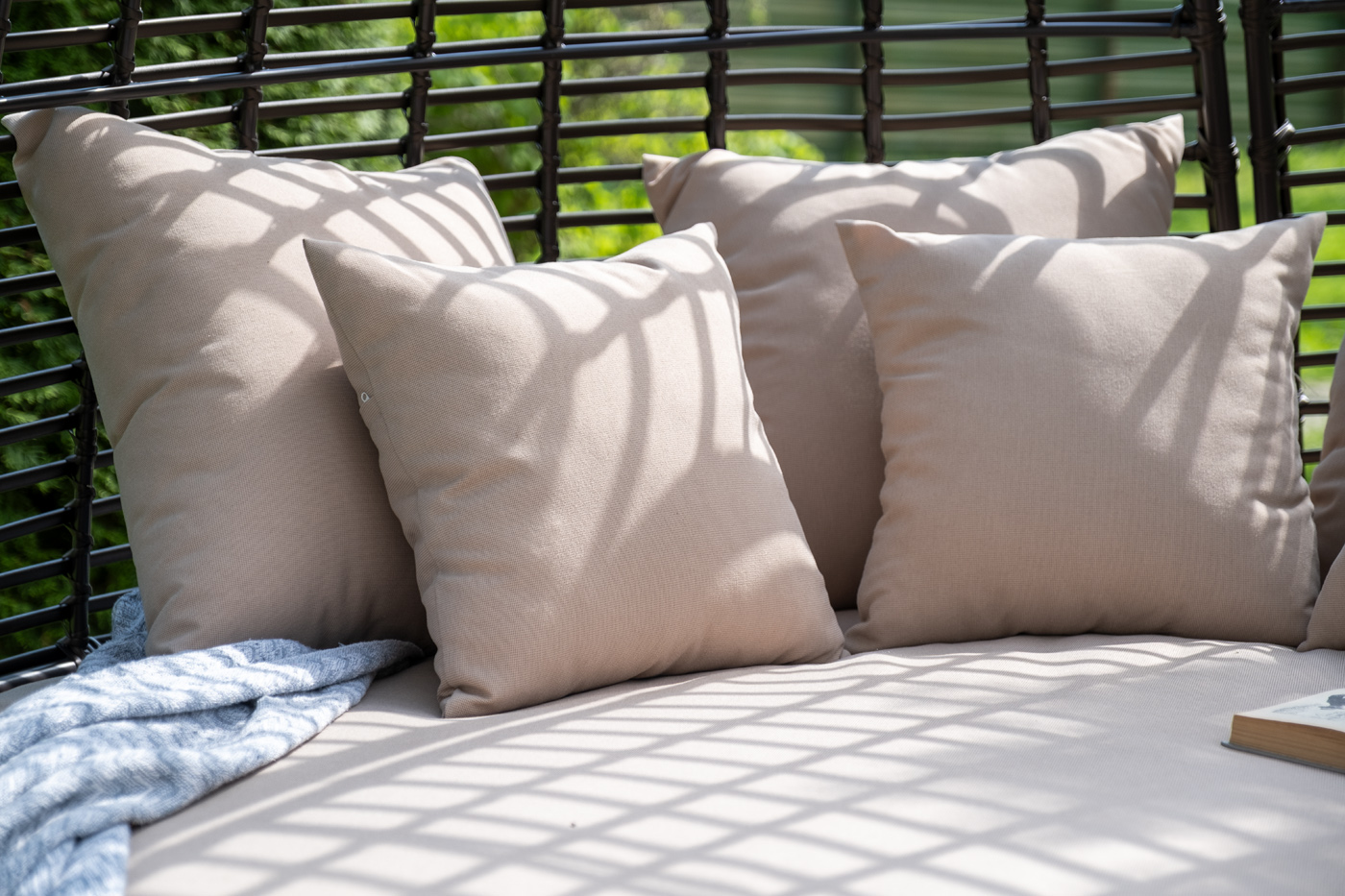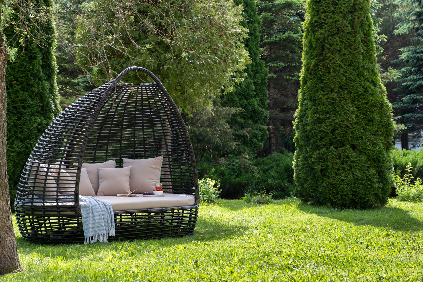 Функциональная полукруглая кровать выполнена плетением вручную из искусственного ротанга. Конструкция усилена алюминиевым каркасом.