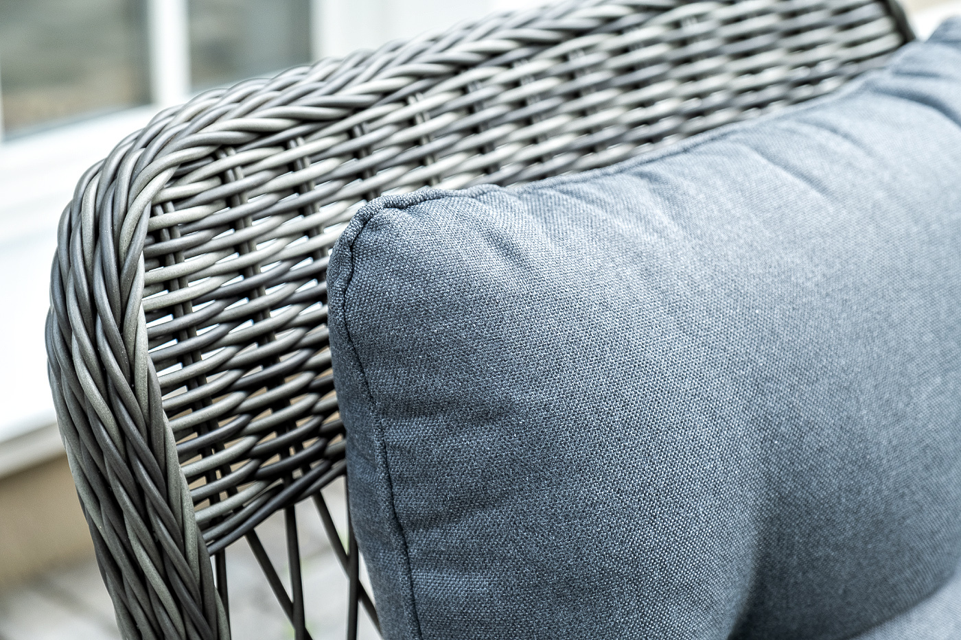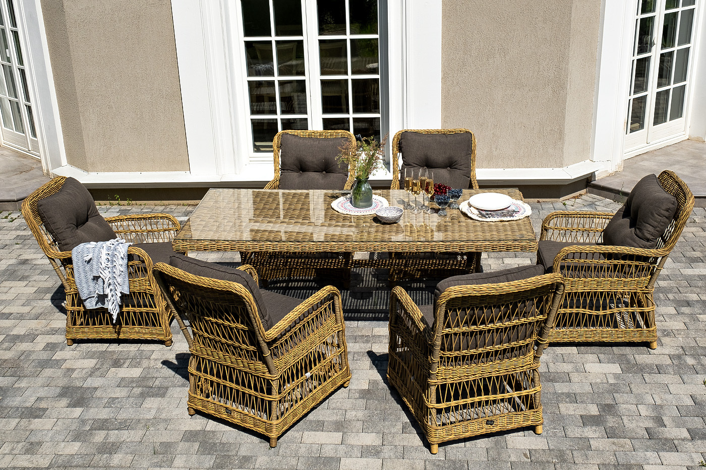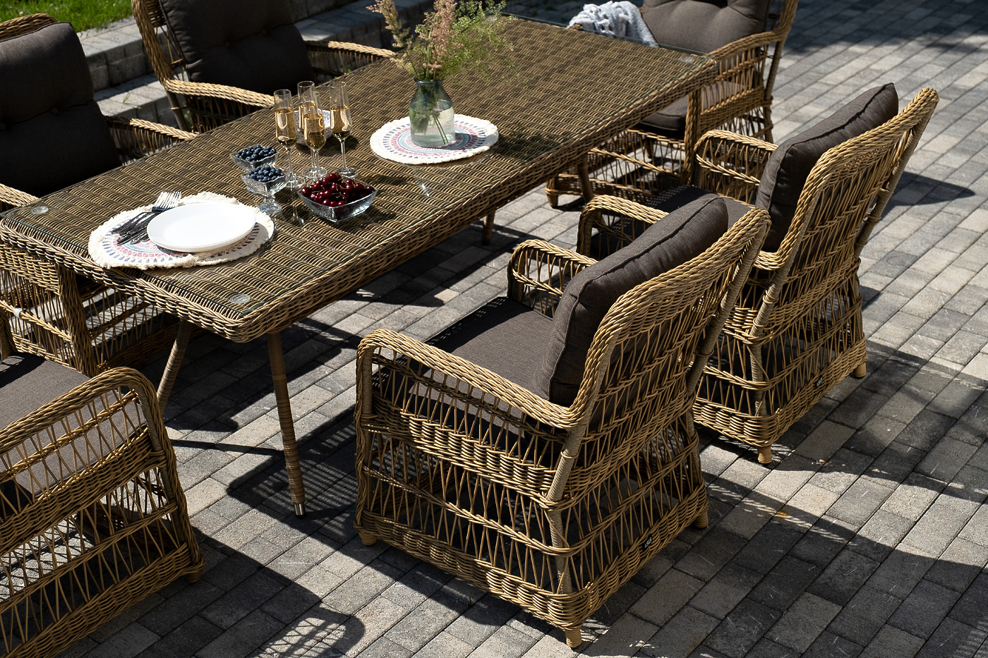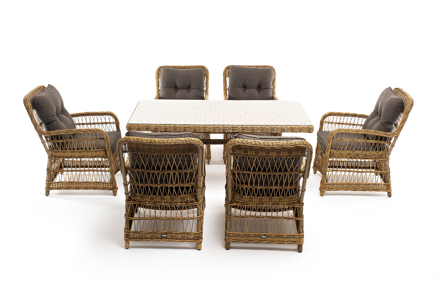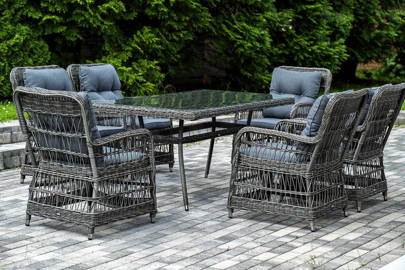 Вся мебель изготовлена из алюминия, вручную оплетенного круглым искусственным ротангом графитового оттенка. Столешница укомплектована ударопрочным стеклом, толщиной 5 мм. Данное стекло крепится к столу при помощи четырех вакуумных силиконовых присосок и поставляется в собранном виде.