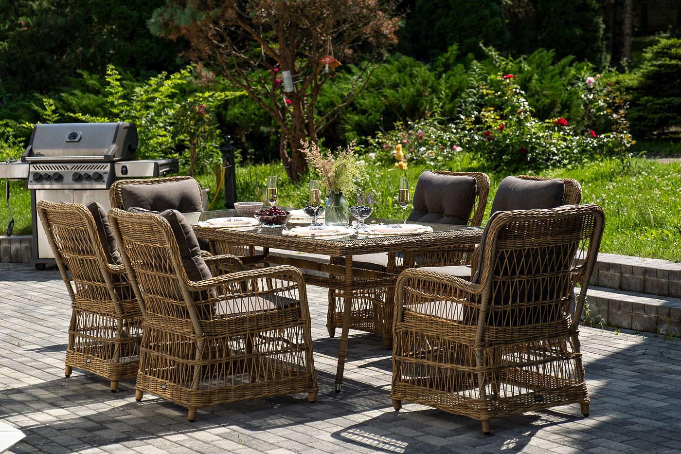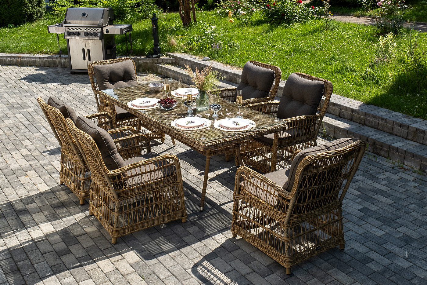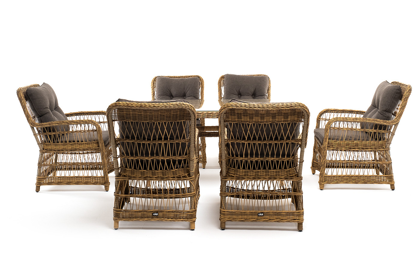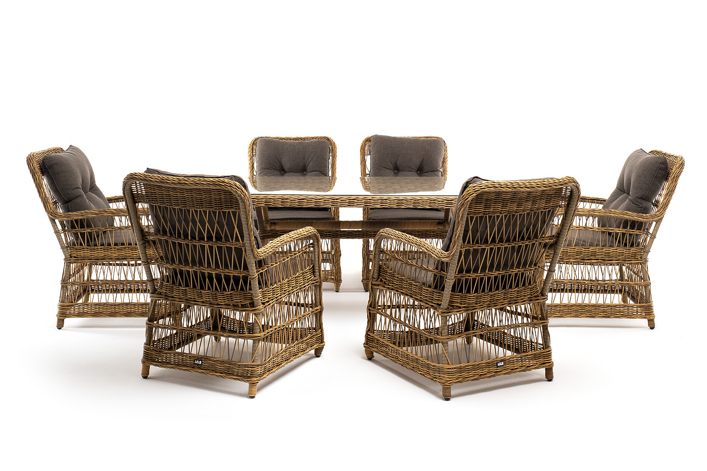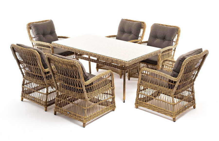 Садовая обеденная группа на 6 персон «Цесена» из ротанга. В комплекте: большой прямоугольный обеденный стол (1600×900×750 мм) и 6 кресел (600×800×910 мм).