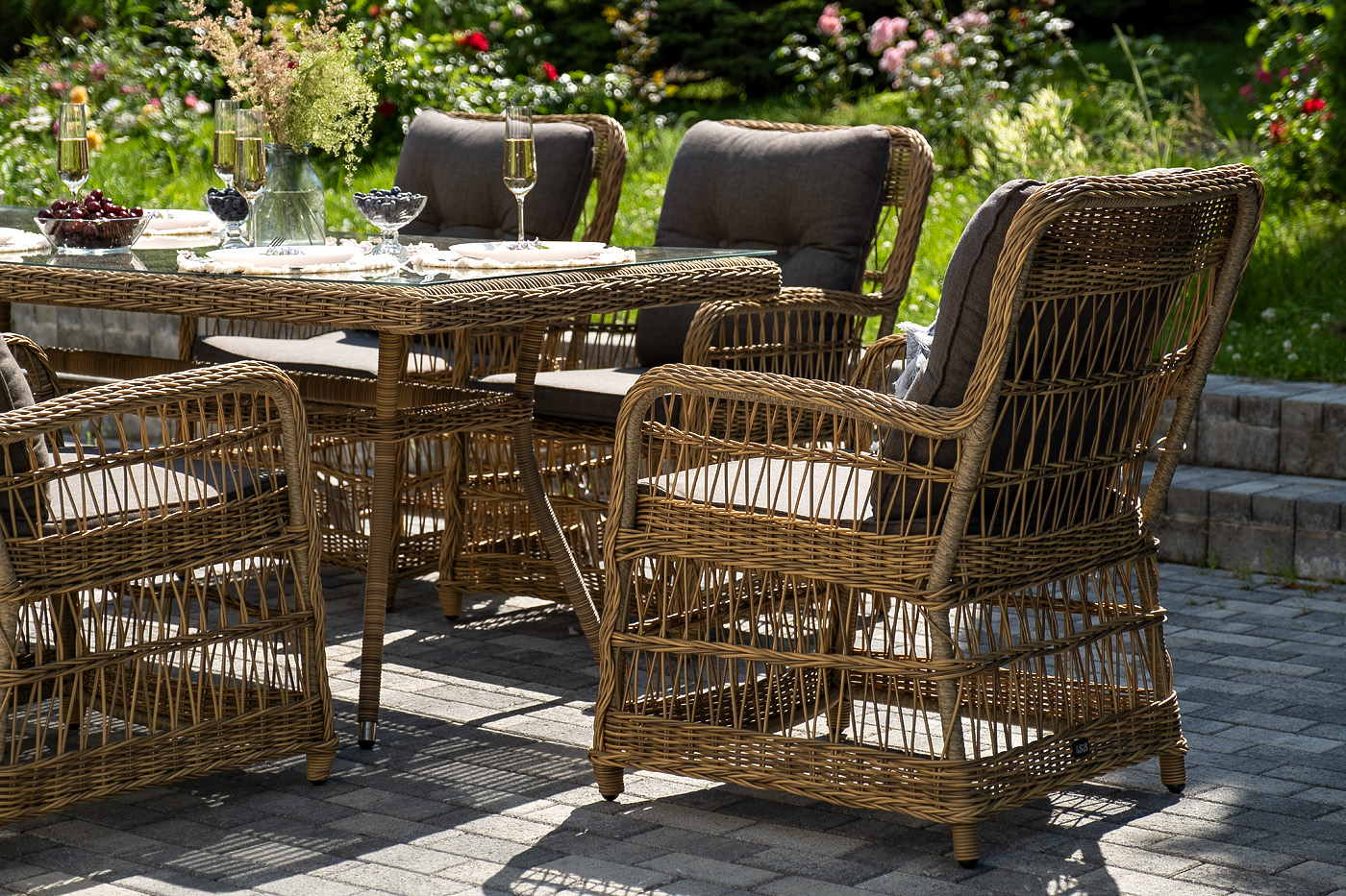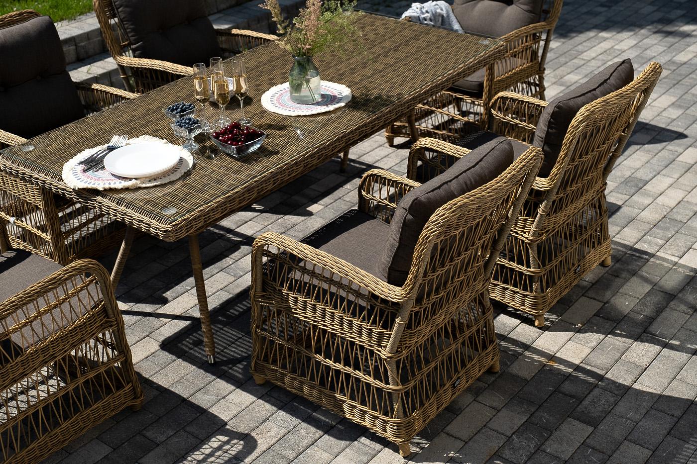 Садовая обеденная группа на 6 персон «Цесена» из ротанга. В комплекте: большой прямоугольный обеденный стол (1600×900×750 мм) и 6 кресел (600×800×910 мм).