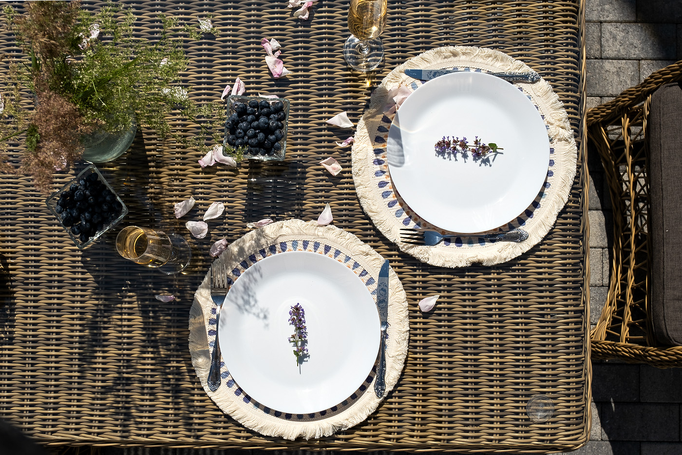 Вся мебель изготовлена из алюминия, вручную оплетенного круглым искусственным ротангом натурального соломенного оттенка. Столешница укомплектована ударопрочным стеклом, толщиной 5 мм. Данное стекло крепится к столу при помощи четырех вакуумных силиконовых присосок и поставляется в собранном виде.