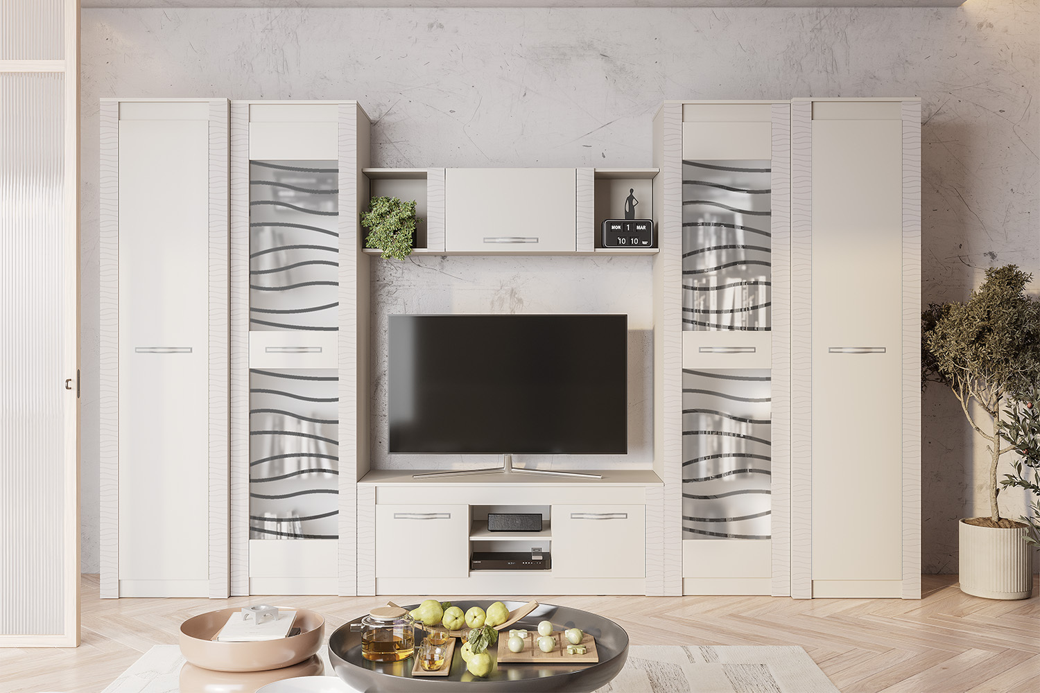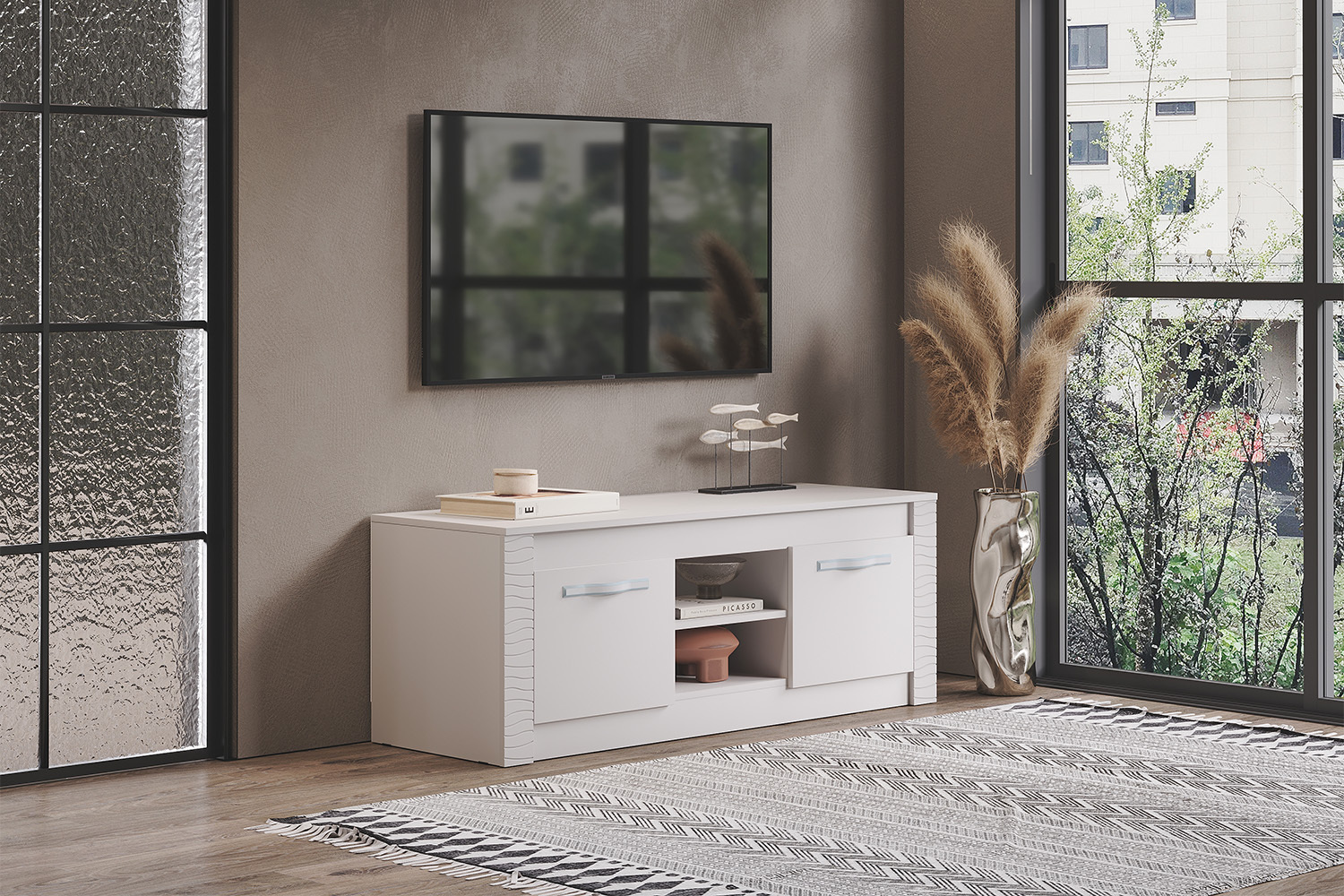 Стильная и лаконичная тумба под ТВ "Монако" станет украшением вашей гостиной. Модель выполнена в едином стиле с другими модулями мебельной коллекции Монако. Она изготовлена из высококачественной ЛДСП цвета "кашемир" и имеет декоративную отделку фасадов из МДФ. Изделие состоит из двух центральных открытых ниш, а также полок, спрятанных за распашными дверцами. На столешнице вы сможете разместить телевизор, а в зонах хранения – необходимые вещи и технику.