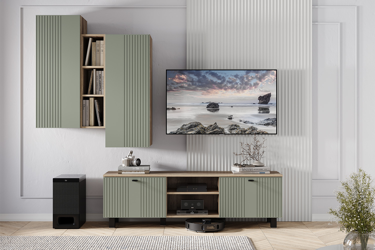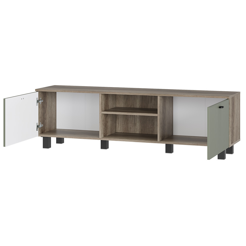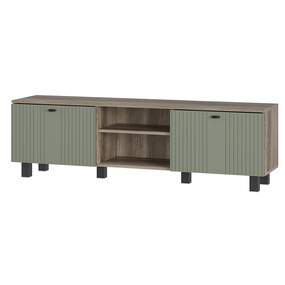 Тумба под ТВ "Олива" выполнена из качественной ЛДСП в цвете "дуб каньон", а фасады отделаны МДФ цвета "муссон софт". На столешнице тумбы поместится телевизор практически любого размера, а в нишах можно хранить необходимую технику.