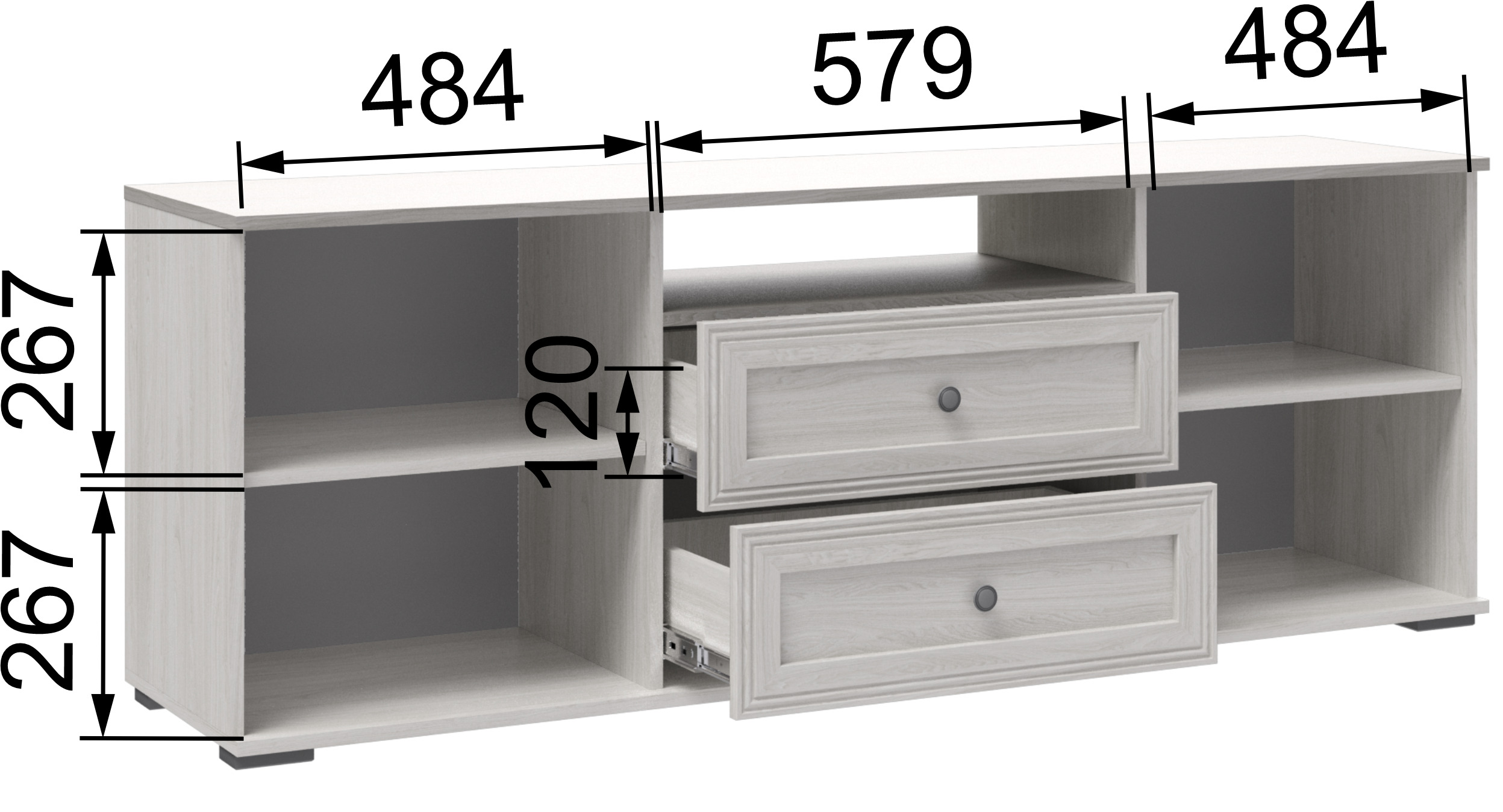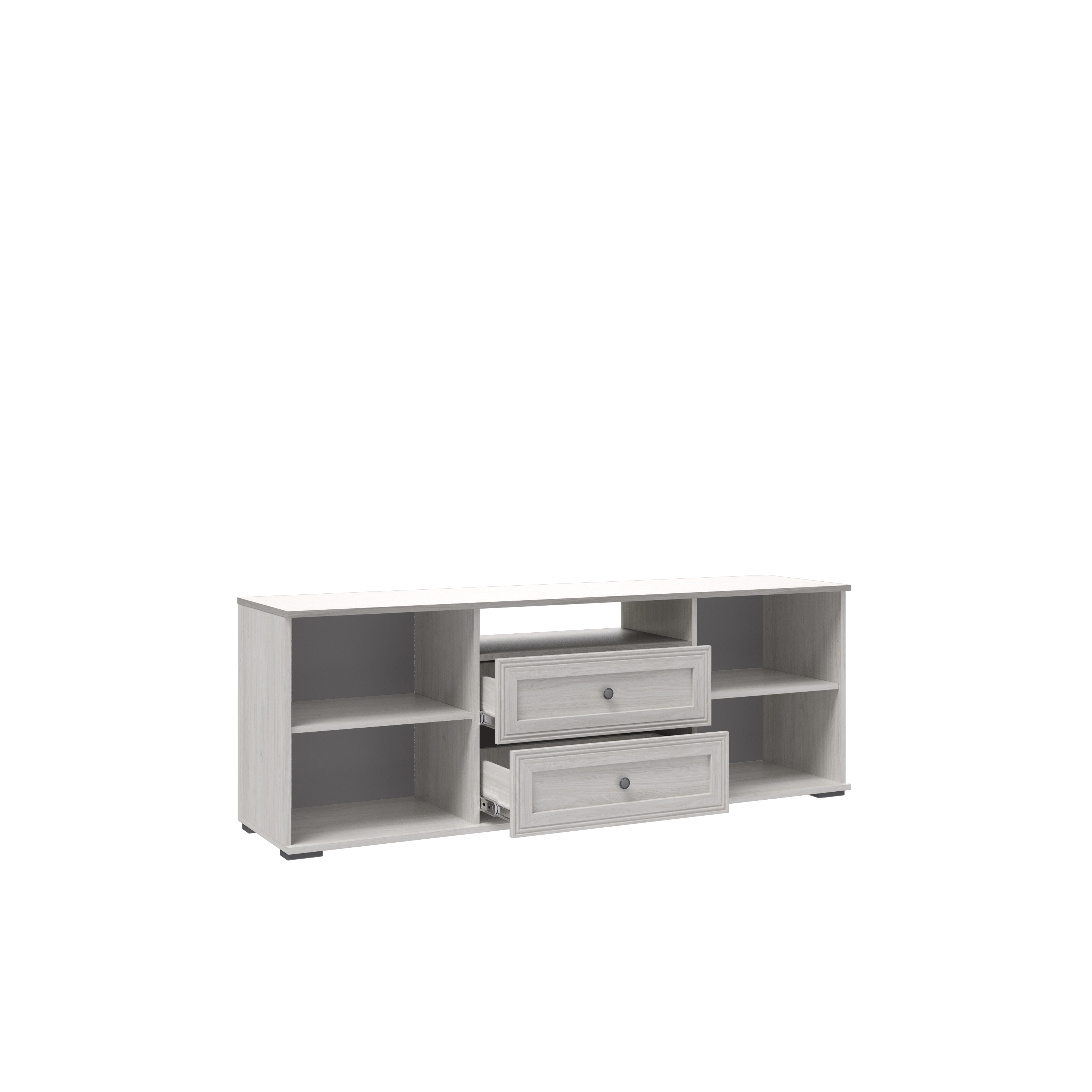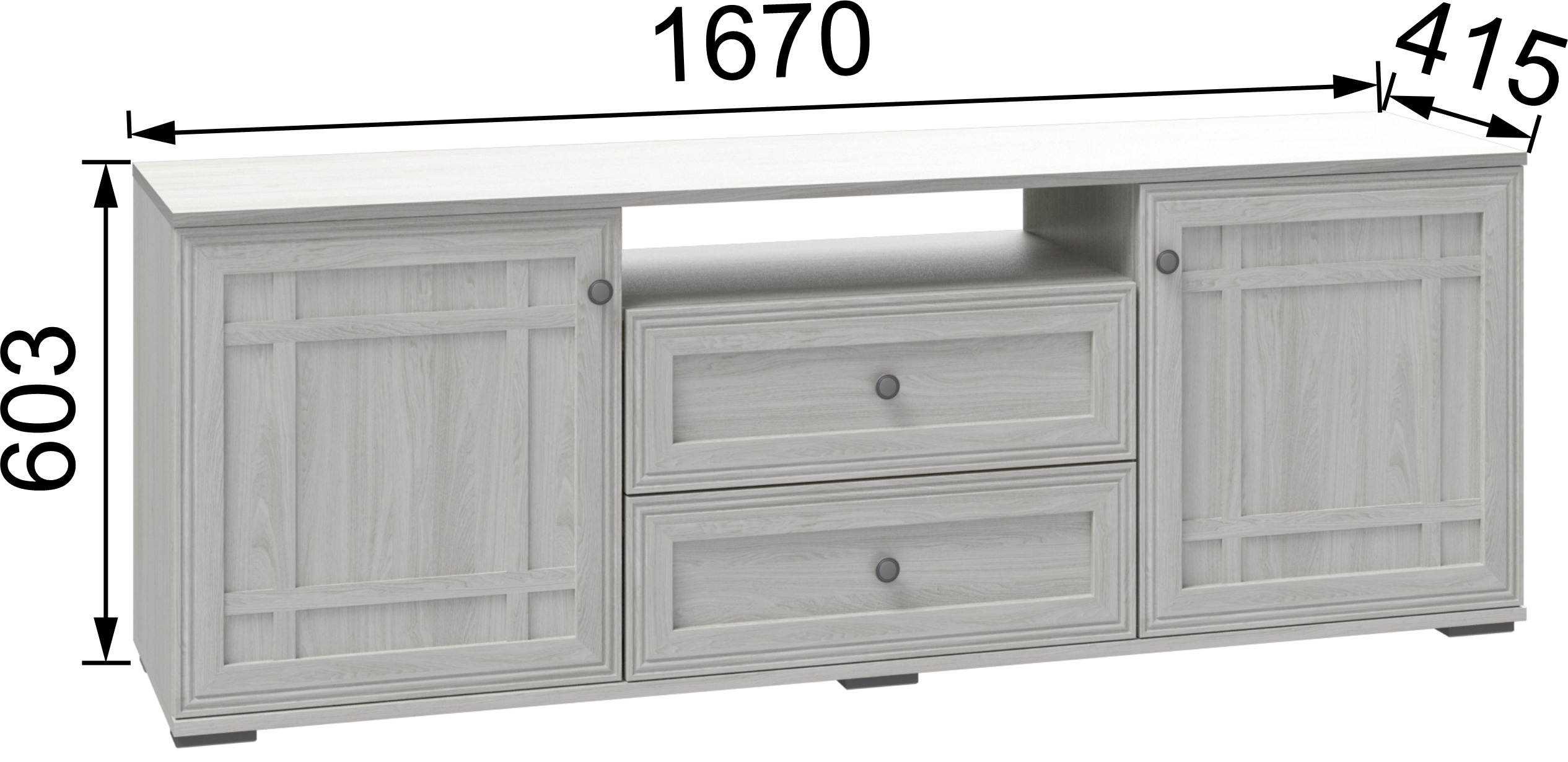 В конструкции предусмотрена открытая полка, которая отлично подойдёт для устройств повседневного использования или хранения необходимых мелочей с быстрым доступом. По бокам тумбы расположены распашные дверцы, за которыми находятся полки для аккуратного хранения различных предметов. Дополняют функциональность модели два вместительных выдвижных ящика, позволяющих удобно разместить аксессуары, документы или другие вещи, сохраняя порядок и эстетичный внешний вид.