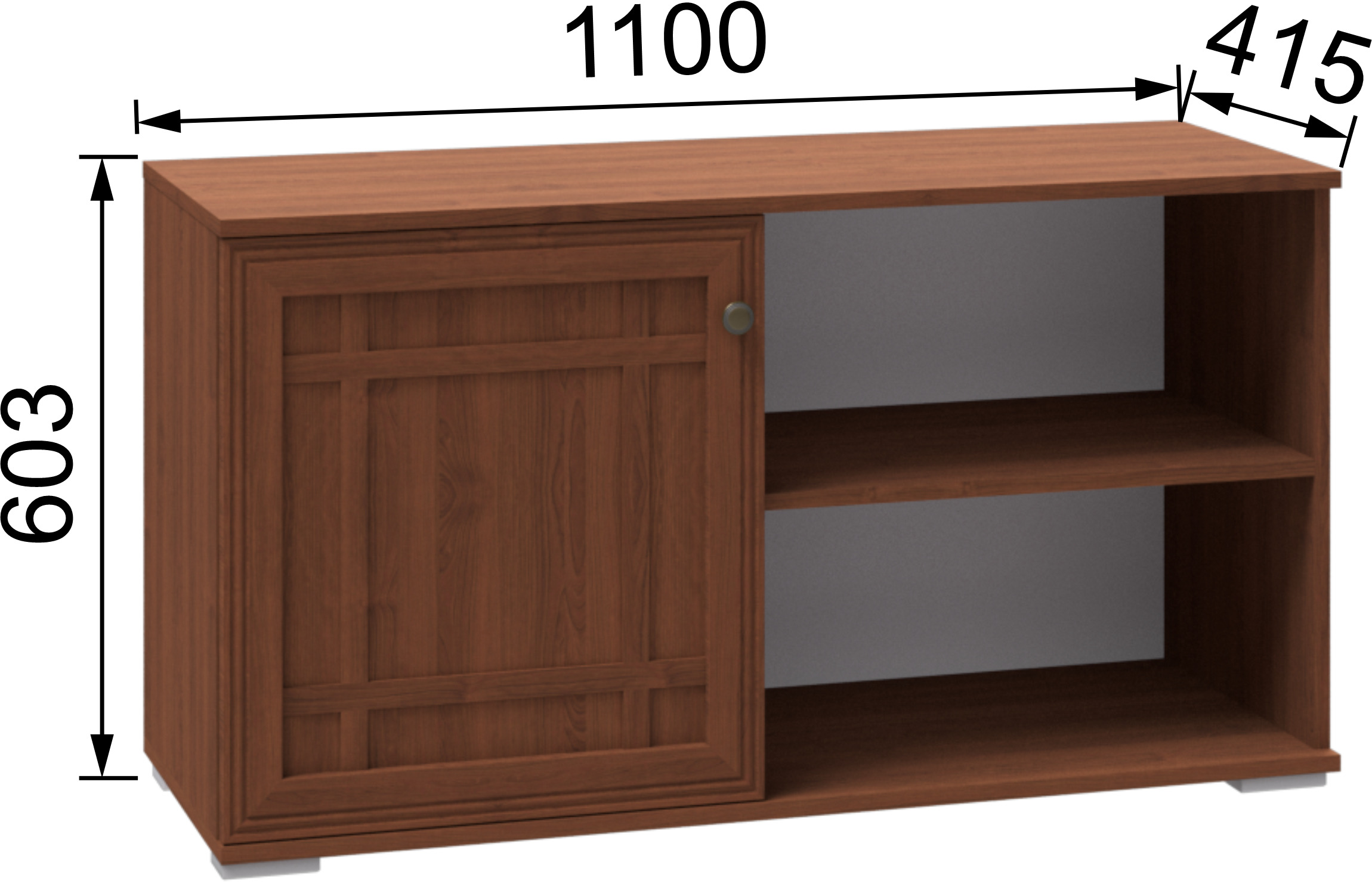 В конструкции предусмотрена открытая полка, которая отлично подойдёт для устройств повседневного использования или хранения необходимых мелочей с быстрым доступом. По бокам тумбы расположены распашные дверцы, за которыми находятся полки для аккуратного хранения различных предметов. Дополняют функциональность модели два вместительных выдвижных ящика, позволяющих удобно разместить аксессуары, документы или другие вещи, сохраняя порядок и эстетичный внешний вид.