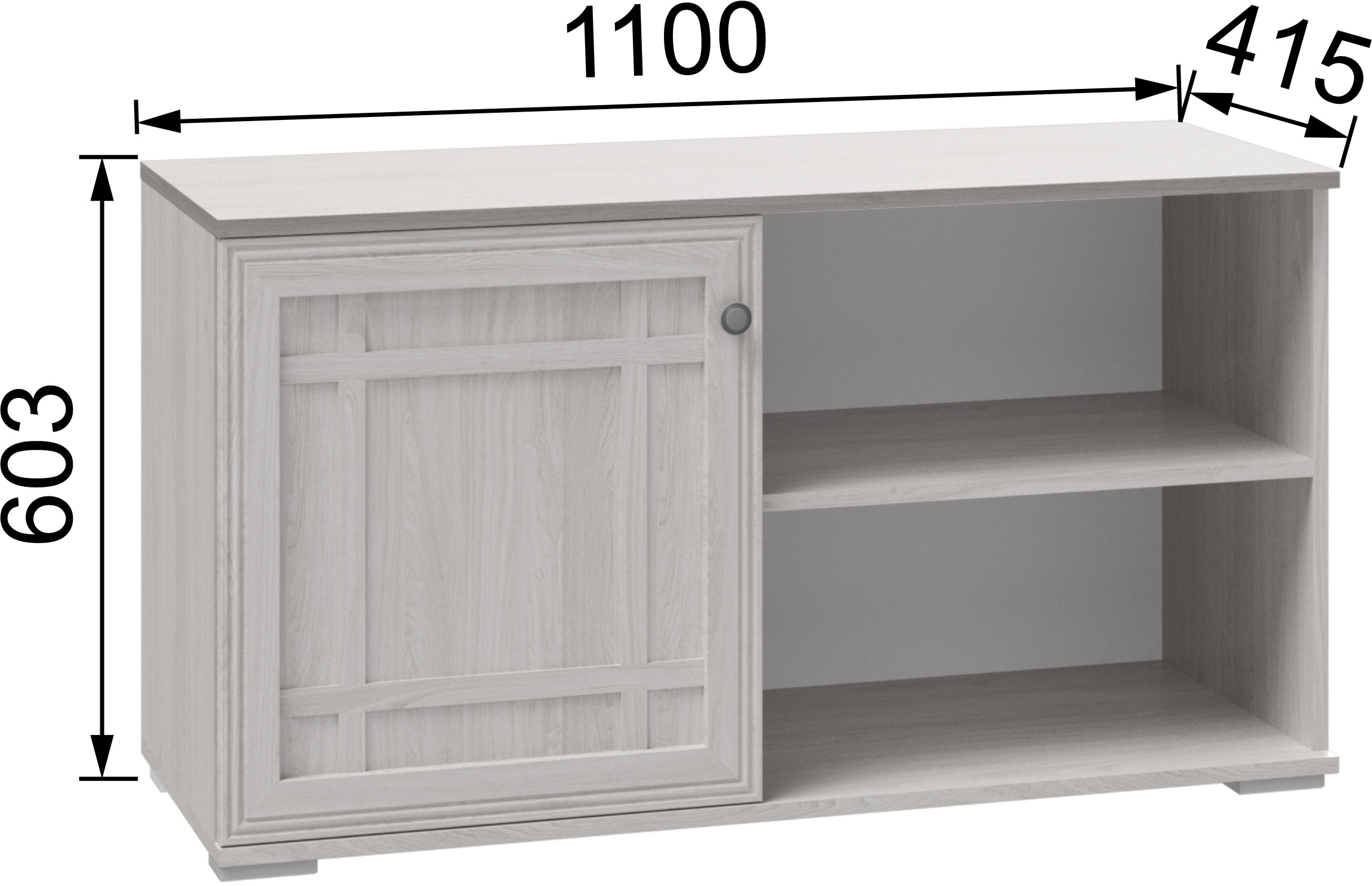 В конструкции предусмотрена открытая полка, которая отлично подойдёт для устройств повседневного использования или хранения необходимых мелочей с быстрым доступом. По бокам тумбы расположены распашные дверцы, за которыми находятся полки для аккуратного хранения различных предметов. Дополняют функциональность модели два вместительных выдвижных ящика, позволяющих удобно разместить аксессуары, документы или другие вещи, сохраняя порядок и эстетичный внешний вид.